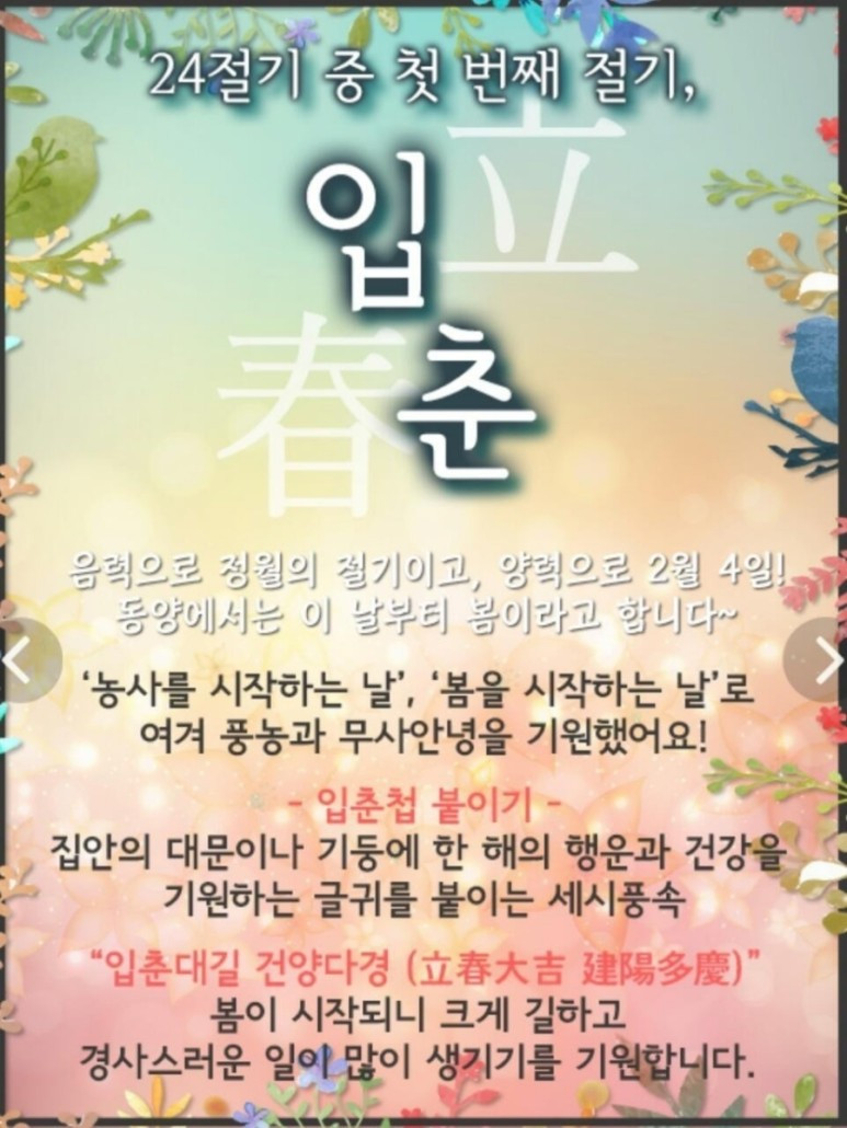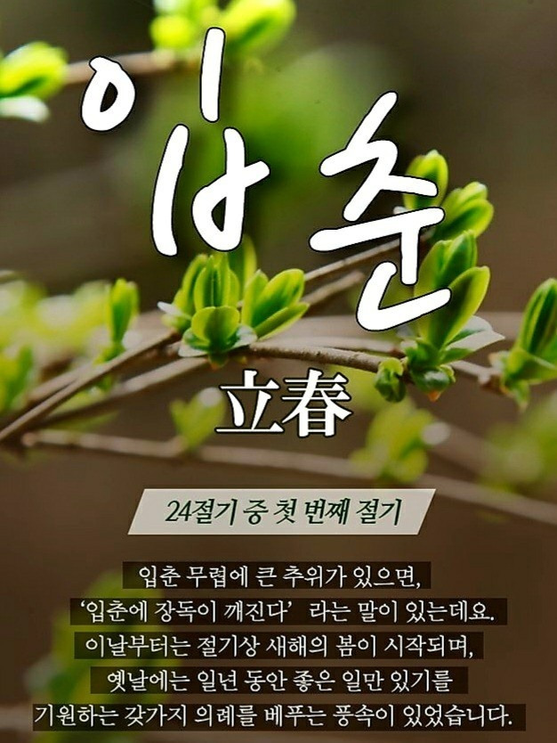 봄의 시작 입춘(立春)입니다!! 입춘을 앞두고 추위가 풀렸지만, 여전히 어수선한 분위기에 우리 마음 은 한겨울에 머물러 있지 않나 싶습니다. 그래도, 봄의 시작 입춘날인데, 이번 주말은 좋은 일이 생기지 않을까 살짝 기대를 해봅니다. 편안한 저녁 되세요. ^^