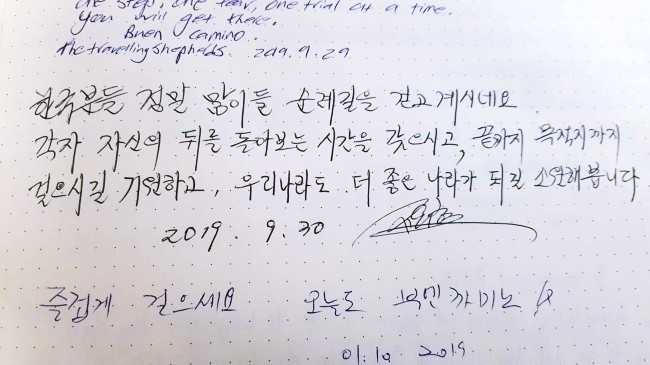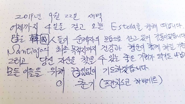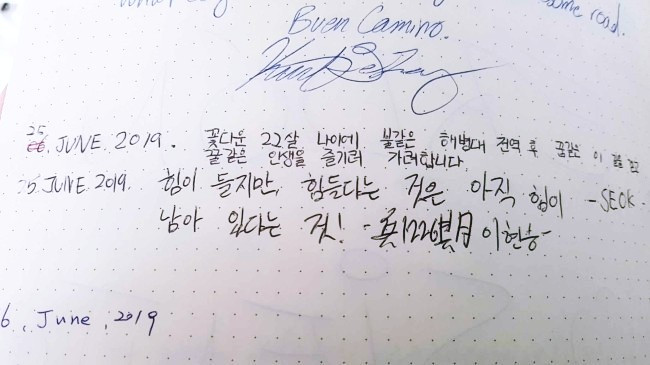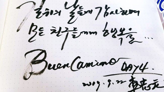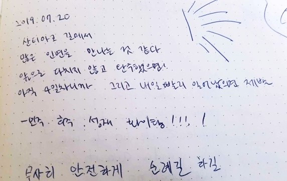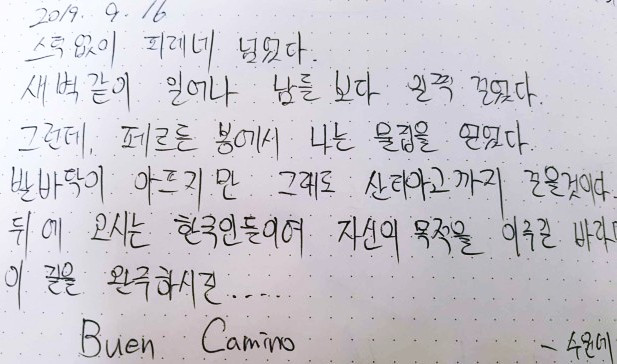 오늘은 걷다가 혼자 엉엉 울었다. 후회하지 말자고 내일도 다짐한다. 이 길을 걷는 사람들. 걸었던 사람들, 정말 다들 대단하다. (중략) 모두 안전하게 다치지 말고 할 수 있는 만큼 걸으세요. 모두 부엔 까미노