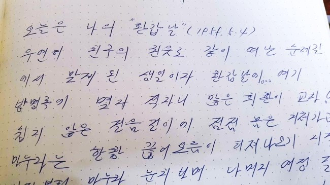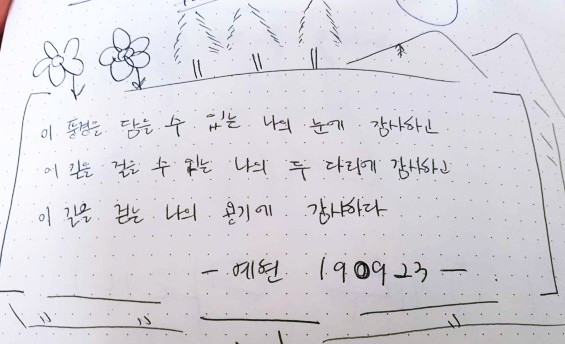 하루하루가 내가 상상할 수 없는 시간들로 꽉 채워간다. 이곳에 와서 새로운 사람들을 만나고 친구가 되고, 벅차고 기쁜 순간들이다. 몸이 많이 고되지만, 마침내 이 길 끝에 자랑스럽게 서 있을 수 있기를 기도한다