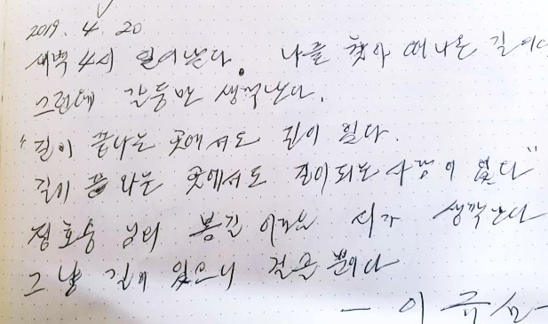 길이 끝나는 곳에서도 길이 있다. 길이 끝나는 곳에서도 길이 되는 사람이 있다. 정호승 님의 봄길이라는 시가 생각난다. 그냥 길이 있으니 걸을 뿐이다