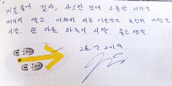 오늘은 몇 킬로 걸어. 이곳에 왔는지. 앞으로는 얼마나 더 가야 하는지. 더 길게 생각하고 재지 마십시오. 내일도 , 오늘도 계속해서 걸어가는 것이 중요합니다. 지치고 힘들지언정 지금 발에 붙인 추진력을 잃지 마세요. 이곳에 거친 모든 이들이 더 성장하고 성수하길. 부엔 까미노
