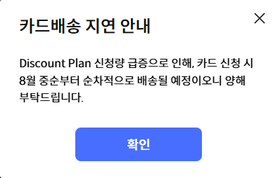 현재 신한 카드 사이트에 들어가면 신청량 급증으로 배송 지연이 된다는 팝업창이 뜬다.