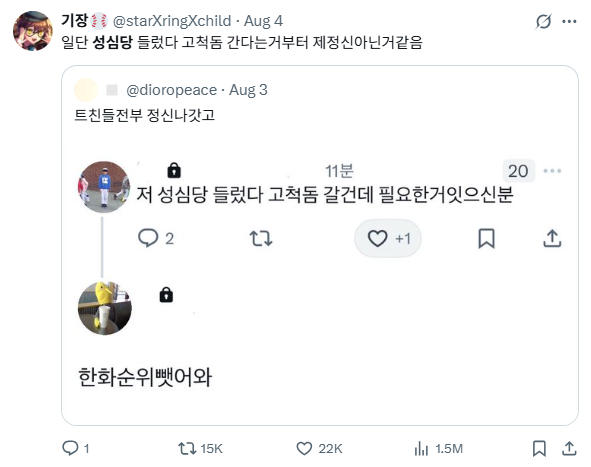 대전 출신이라 할아버지 - 아버지를 따라 한화를 응원하기는 했지만, 여태 좋은 성적을 기록한 적이 없어 야구 경기를 제대로 본 기억이 없다. 우스갯소리로 '한화 팬이면 인내심 좋겠다'라는 얘기도 들어본 적이 있다.