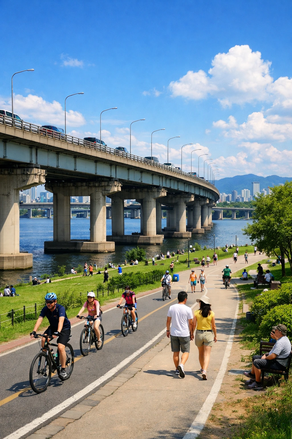 화창한 날 한강시민공원에는 많은 사람들이 여유롭게 산책하고 자전거를 탄다.