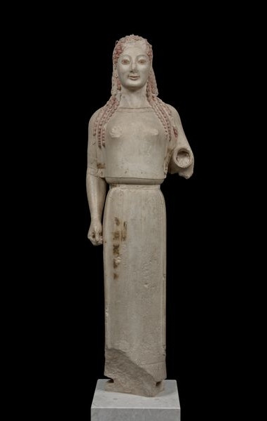 아르카익 시대의 그리스 조각상은 이집트의 영향을 크게 받은 모습이다. 수직성과 정면성에서 벗어나지 못한 아르카익 시대의 조각상은 이집트 조각 못지않은 뻣뻣한 차렷 자세와 다소 억지스러운 미소로 "정말 그리스 조각이야?"라는 의문을 가질만하다. 그래서인지 연대기적 구성을 따른 그리스 미술 전시에 가면 초반부에 크게 당황하시는 분들이 빈번히 목격된다.