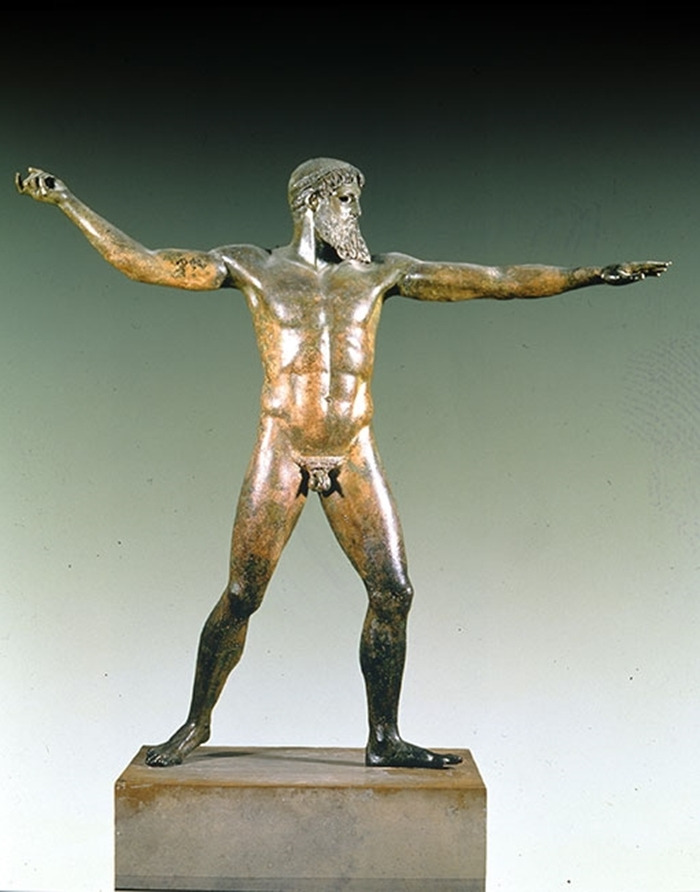 아테네 국립고고학박물관이 자랑하는 아르테미시온의 청동상은 고전기의 엄격 양식(Severe style)을 충실히 따른 그리스 조각상으로, 고대 그리스 신화의 포세이돈 혹은 제우스 신을 묘사한 작품이다. 다리를 안정적으로 벌린 포세이돈 혹은 제우스의 자세에서 콘트라포스토가 확립된 것을 확인할 수 있다. 안정된 하반신과 수직적 몸통, 포세이돈의 삼지창 혹은 제우스의 번개를 던지려는 상반신의 역동성은 정중동의 미학을 드러낸다. (https://www.namuseum.gr/en/collection/klasiki-periodos-3/)
