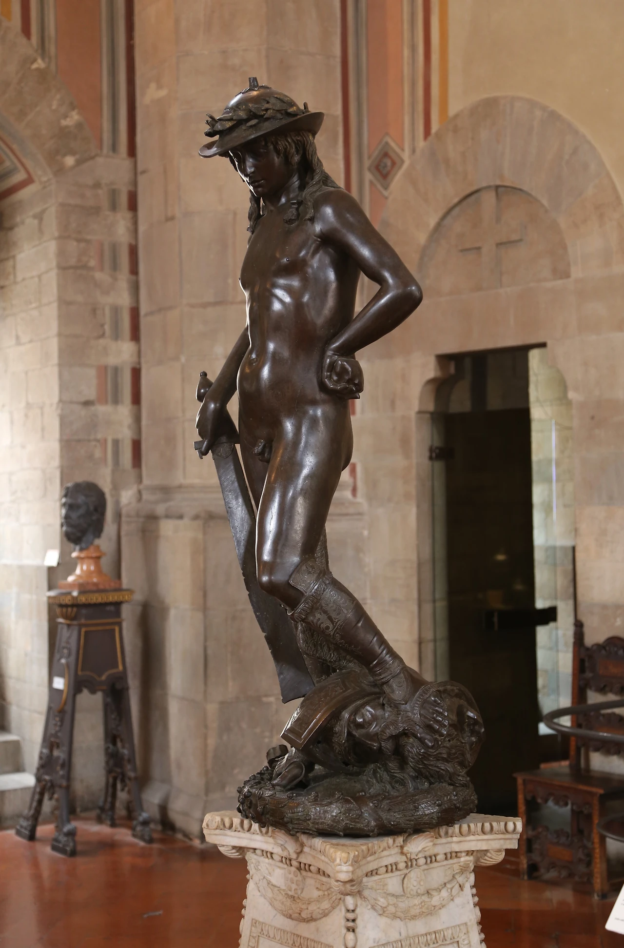 도나텔로(c. 1386-1466)의 끝내주는 대표작 〈다비드〉(c. 1440)는 고대 로마 제국 이후 천 년 동안 이어진 중세의 보수적인 분위기를 깨고 다시 등장한 실물 크기의 누드 조각상이다. 피렌체 공화국의 ‘국부(國父)’ 코시모 디 조반니 데 메디치(1389-1464)가 주문한 것으로 추정되는 〈다비드〉는 피렌체가 밀라노와의 전쟁에서 승리한 것을 기념하기 위한 작품일 가능성이 있다. 다윗(=다비드)은 거인 골리앗을 쓰러뜨린 구약최고의 영웅인만큼 전쟁에서 승리한 사건을 칭송하고 시민들의 사기를 높이기에 이만한 기념물도 없었을 것이다. 골리앗의 버리를 밟고 짝다리를 한 다윗의 자세는 도나텔로가 재발견한 고대 그리스식 인체의 자연스러움, 곧 콘트라포스토 개념을 충실히 반영했다. 또한 다윗은 위대한 영웅임에도 우락부락한 남성이 아니라 소년의 몸매로 묘사돼 도나텔로가 추구한 사실주의적 표현을 드러낸다. (로마 황제 하드리아누스가 총애한 미소년 안티누스의 조각으로부터 영감을 받았다는 카더라도 있다.)