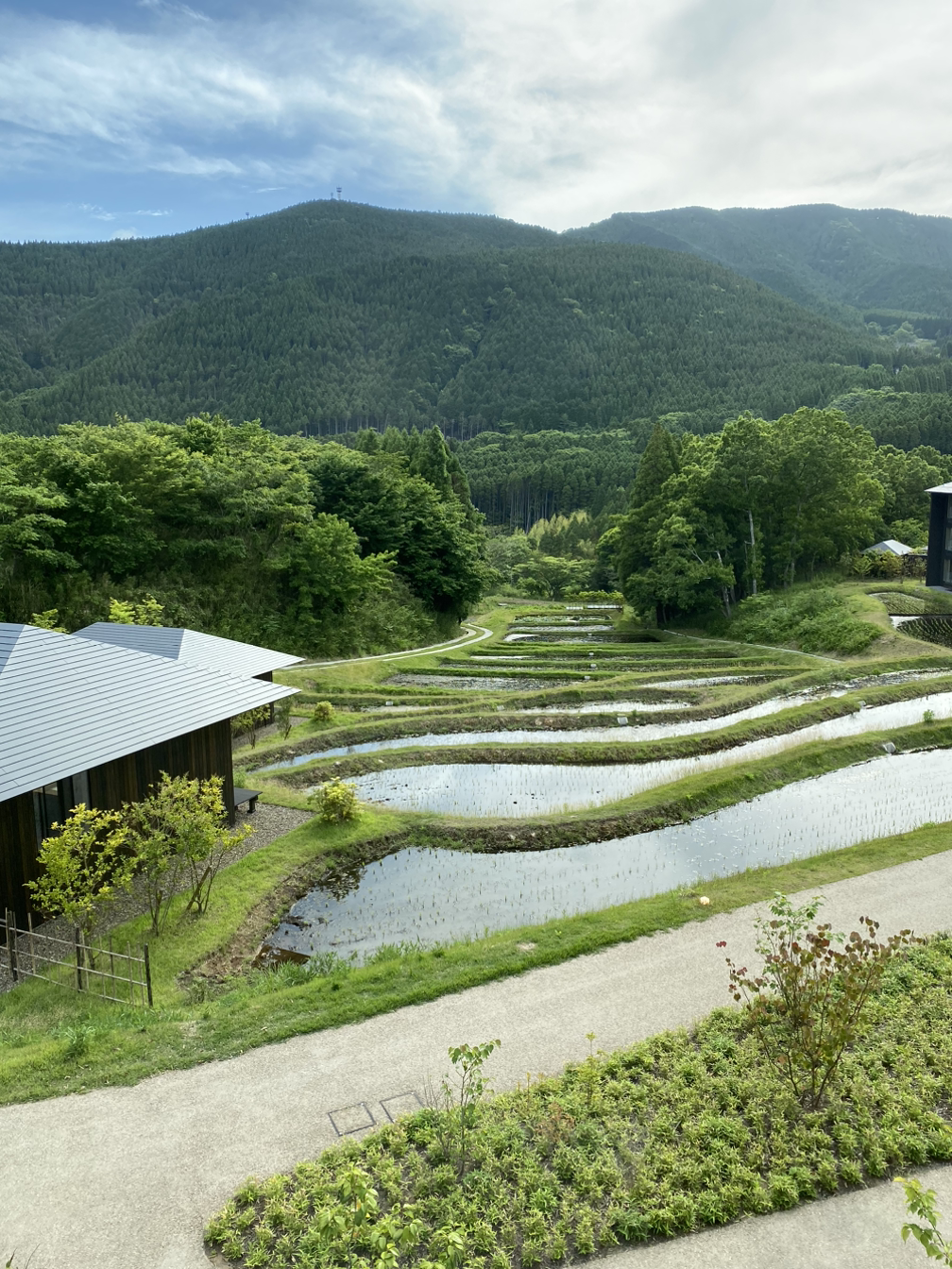카이 유후인의 본관 2층 테라스에서 보는 계단식 논.