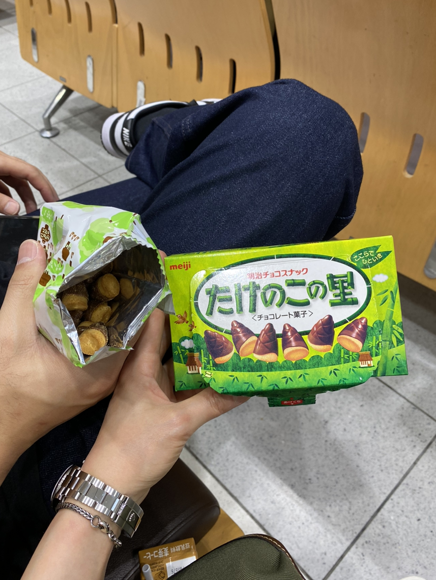 인천-후쿠오카 구간의 대한항공은 약 1시간 30분 만에 후쿠오카 공항에 도착하는데 중간에 식사도 한 번 나옴. 기내에서 유난히 소화불량이 잦아서 특별기내식 한국 채식으로 변경. 보통 두부와 우엉조림이 나오며 둘 다 좋아하기 때문에 기뻐하며 취식. 소화 상태도 매우 좋음. 5월부터 코로나 관련 서류 없이 앱을 통해 사전입국심사가 거의 완료됐고 찾을 짐도 없기 때문에 물 흐르듯 통과. 후쿠오카공항-유후인을 연결하는 버스 시간까지 무려 2시간이 남았고 이럴 땐 공항 편의점을 털어줘야 함. 일단 타케노코노사토와 커피맛 두유부터. 한국에서도 건어물 여동생 우마루짱 때문에 인지도 높은 타케노코노사토. 해석은 죽순(타케노코)마을(사토)로, 우리 식으로 하면 대략 초코죽순쯤 될 듯(?). 과자 부분이 약간 버터링쿠키 같이 부드럽고 먹다 보면 조금 질림.