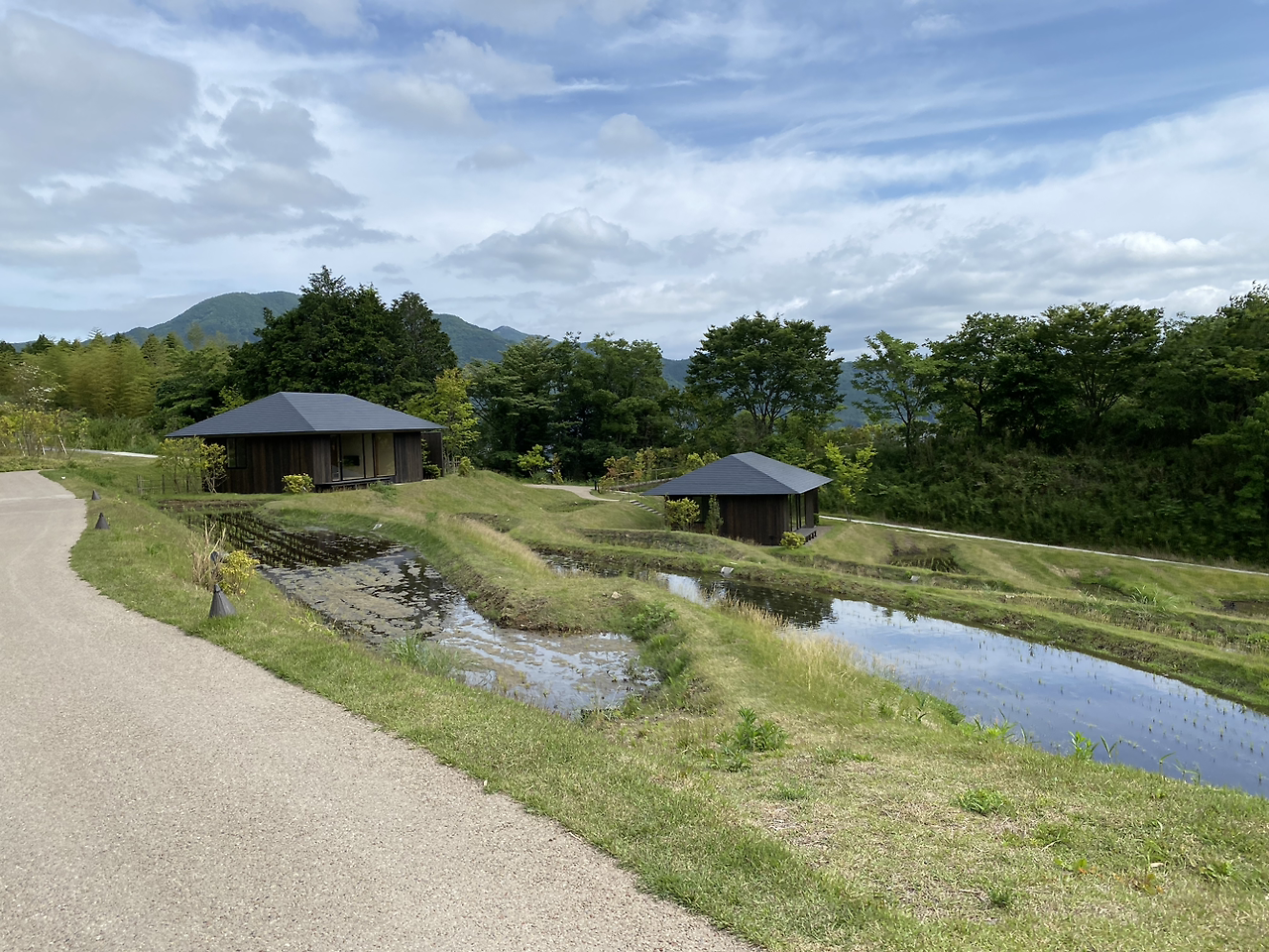 유후인역-카이 유후인은 차량으로 10분 내외의 거리지만 도보로 접근하기는 어려운 환경임. 대부분 경사로의 찻길이고 도보용 인도는 없음. 카이 유후인으로 가는 길은 갓 모내기가 끝난 논 풍경이라 눈이 매우 즐거움. 하늘이 비친 물을 파랗고 갓 심긴 벼 이삭은 조그맣고 초록초록함. 환상의 콜라보. 이걸 보러 왔지. 흠.