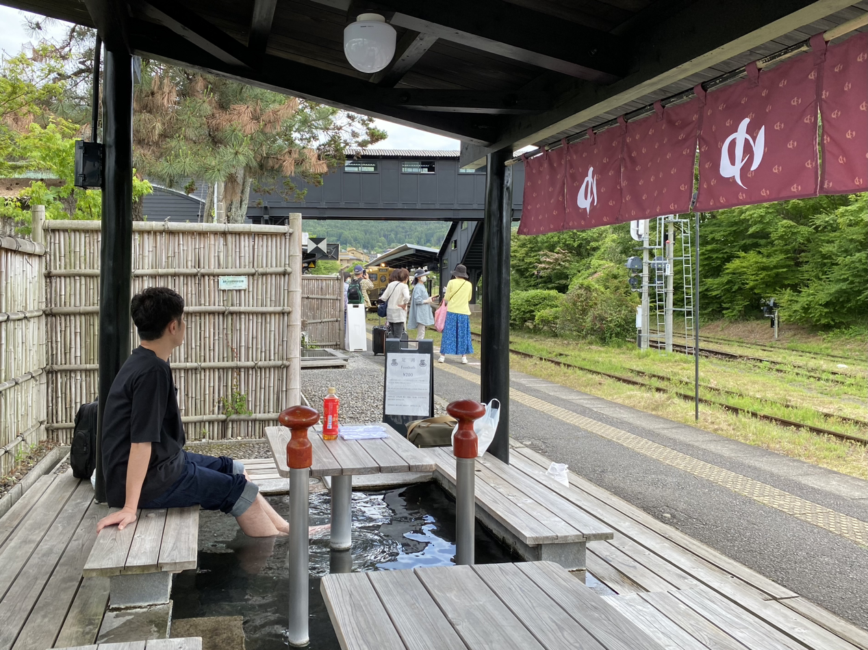 유후인역 내 유료 족욕탕. 기차 탑승자들이 원숭이 구경하듯 쳐다보기는 함.