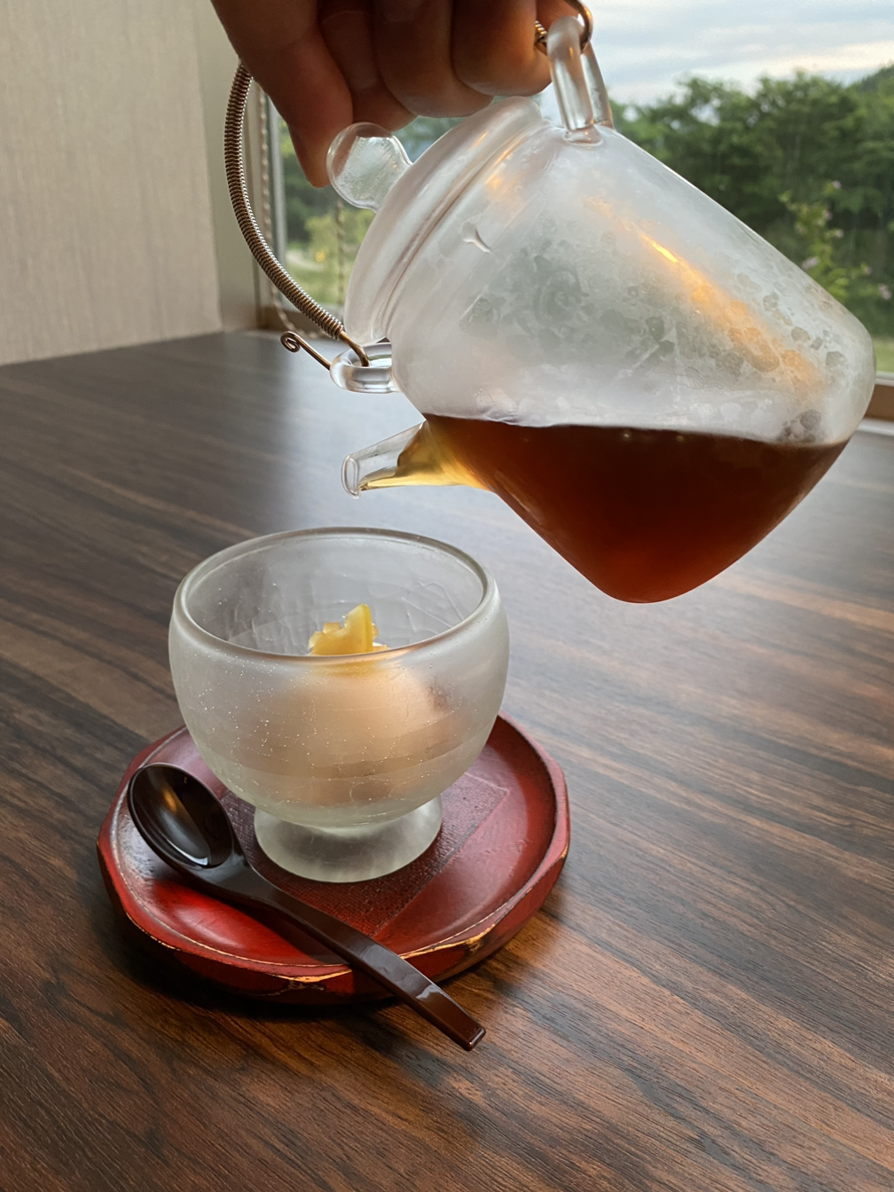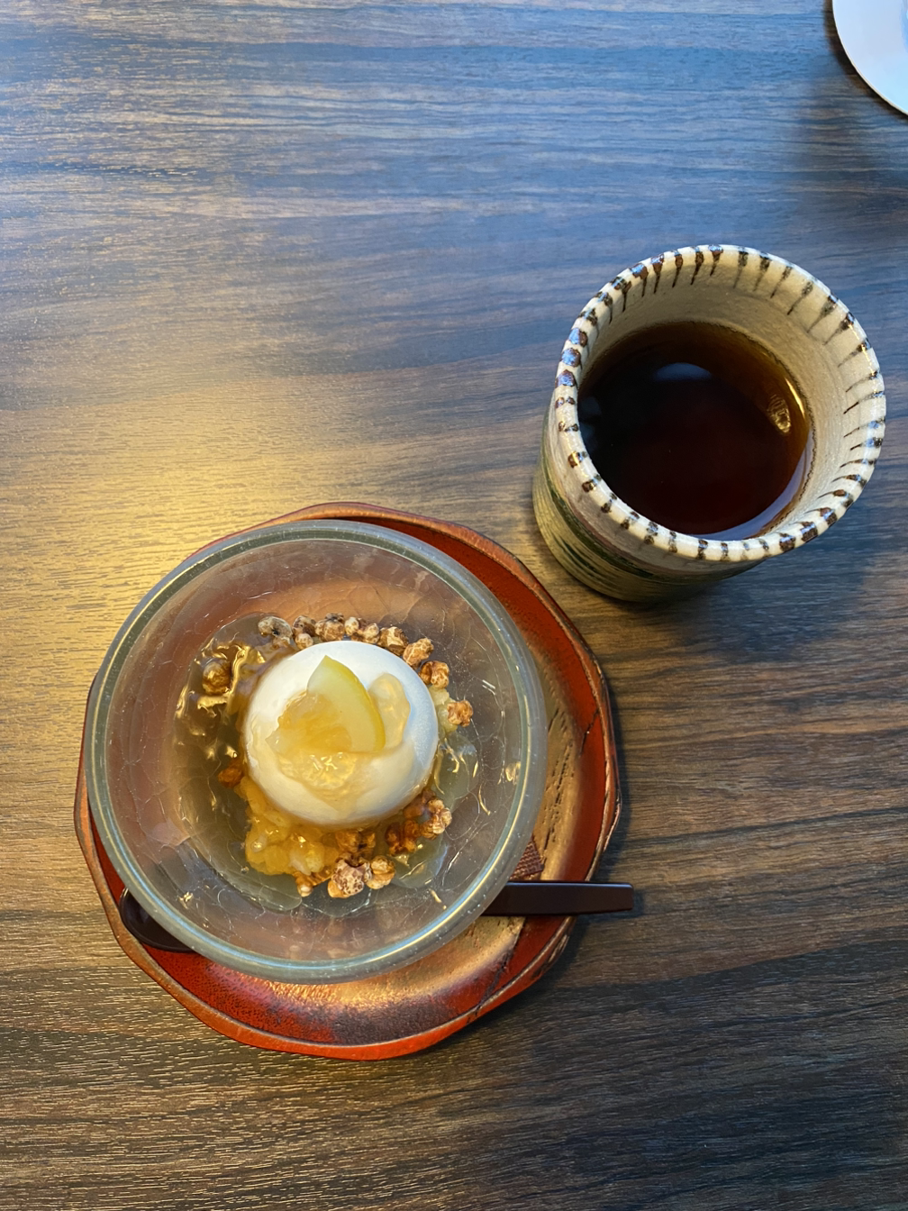 뜨거운 호지차로 속을 개운하게 만들고 있으면 후식 대령. 유자청과 견과를 곁들인 우유 아이스크림과 보리차젤리.