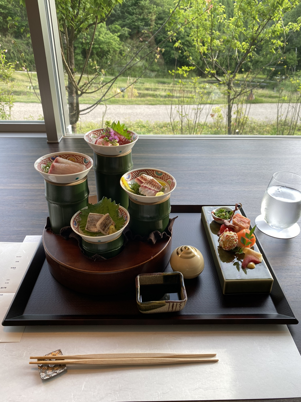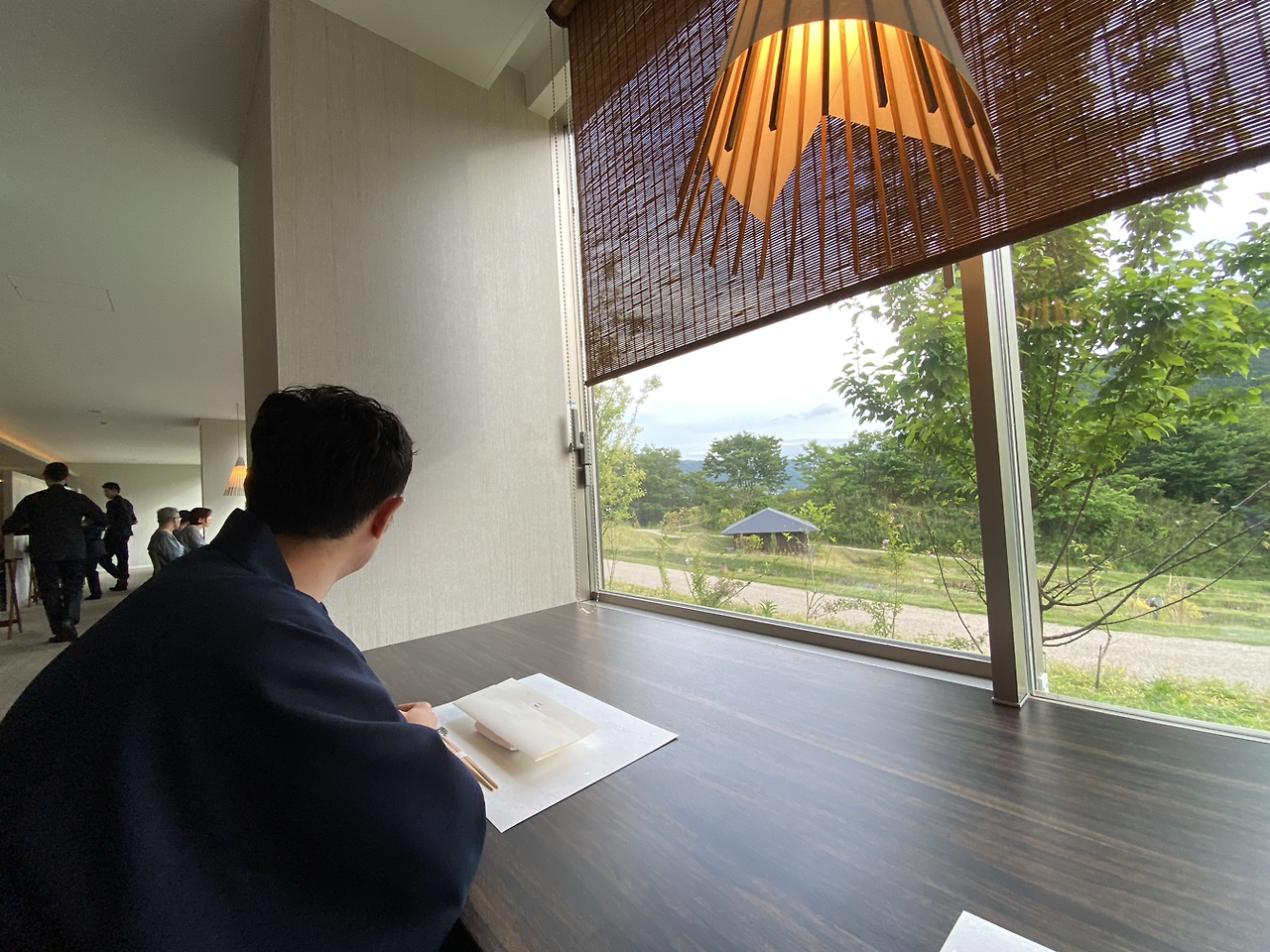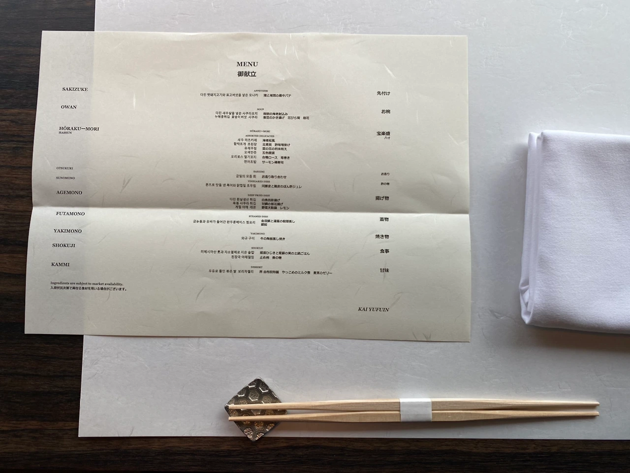 뜨거운 물수건과 함께 숙박자의 국적을 고려한 언어의 메뉴지가 놓임. 질이 좋은 일본 공예지에 출력해 제공. 젓가락도 쥐는 맛이 매우 편안.