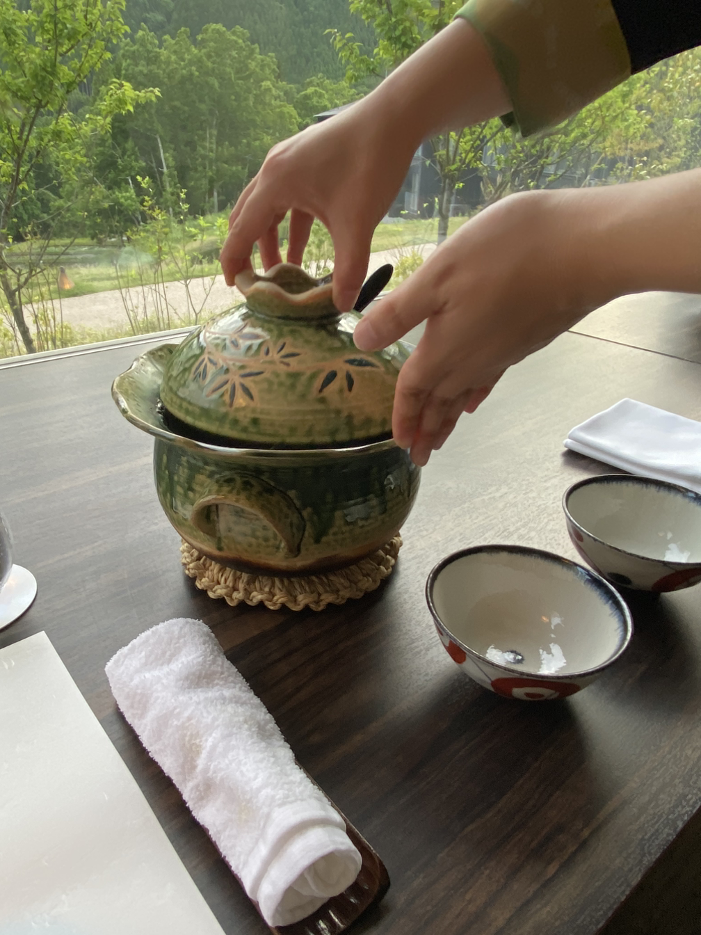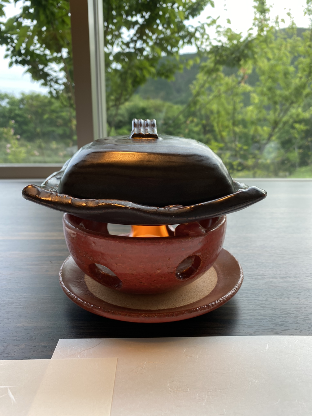좌석 뒤 한 켠에 놓인 솥밥. 식사가 시작된 후 두 번째 음식이 나올 때쯤 불을 올리고 점점 향긋한 냄새가 풍긴다. 내용물이 무엇인지는 메인 메뉴가 나올 때 공개. 두근두근.