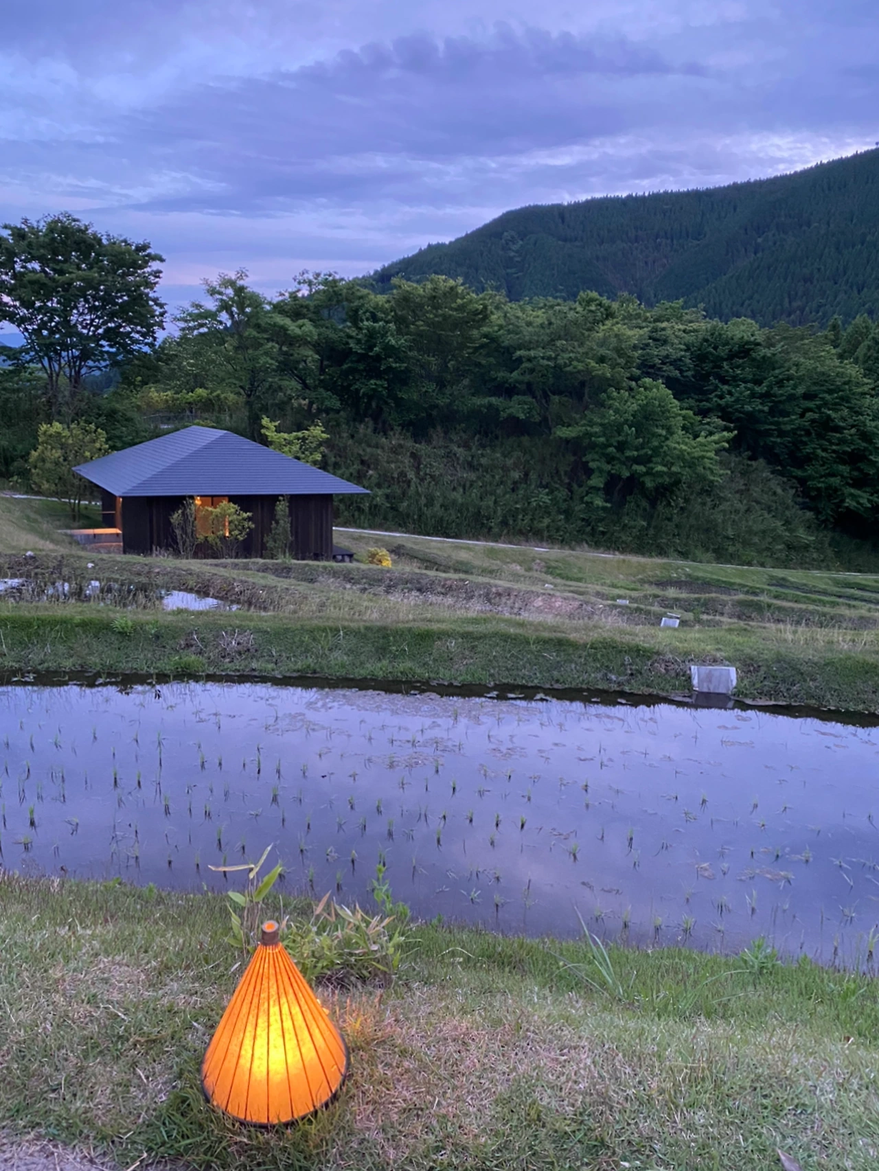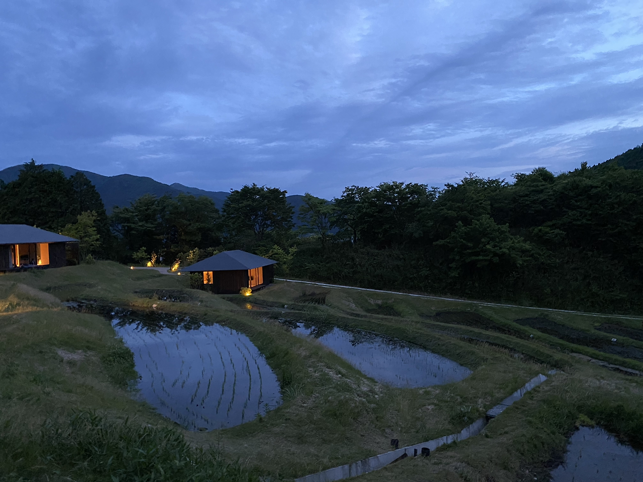 해가 지고 조명이 두드러지니 한층 더 멋있는 카이 유후인의 계단식 논과 별채. 진심으로 천국임.