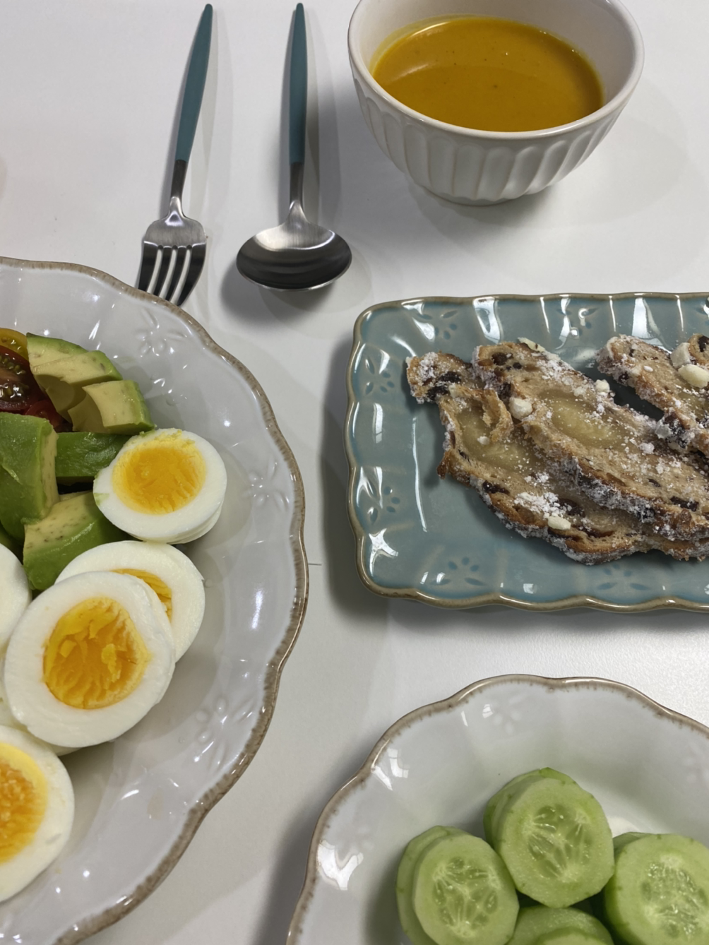 단호박과 계란, 오이, 아보카도, 엊그제 동네 빵집에서 주문해 가져온 슈톨렌, 아주 조금 남은 우유, 당근을 채 썰어 만든 당근 라페, 방울토마토와 옥수수 통조림 등이 조리대에 쌓였다.