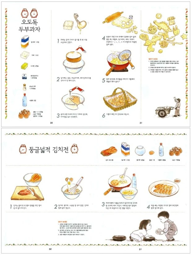 아니나 다를까 이 책은 순간순간마다 제 몫 이상을 해냈다. 특히 타국에서 이 책은 나의 밥이자, 엄마이자, 나라였다. 괜히 울음 터지는 날에는 ‘후루룩 수제비’를 끓여 삼켰고, 처음 맞는 아빠의 기일에는 ‘동그랑 땡그랑 완자전’을 만들어 제사상에 올렸다. 다른 도시에서 공부하던 친구와 만났을 때는 ‘사이사이 떡산적’과 ‘쫀득쫀득 감자전’을 해 먹었다. 외국 친구들을 집으로 초대했을 때는 ‘차례차례 꼬치 불고기’와 ‘나란히 김밥’을 대접했고, 함께 요리를 배우던 스페인 친구들과는 기적적으로 구한 김치 한 봉지로 ‘한입에 쏙 김치 만두’를 빚었다. 모자란 재료와 부족한 솜씨지만 이 책 덕분에 배도 마음도 늘 든든했다. 지금 이 책은 함께 요리를 배우던 스페인 친구 마릴루의 부엌에 있다. 매 과정이 그림으로 그려져 있으니, 재료 몇 가지와 조리에 필요한 동사 몇 가지만 스페인어로 옮겨도 충분했다.