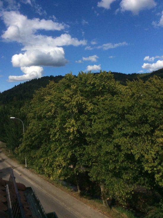 이 사진은 프라이브루크 외곽의 아우(Au)에 머물던 시절, 제가 살던 집 창밖의 풍경입니다. 보시는 것처럼, 마을은 아주 거대한 산맥에 둘러싸여 있었어요. 저렇게 나무가 빽빽하게 들어차, 멀리서 보면 거의 검게 보이는 숲— 바로 그 이름도 유명한 ‘블랙 포레스트(Black Forest)’, 독일어로는 ‘Schwarzwald(슈바르츠발트)’, 직역하면 ‘검은 숲’입니다.