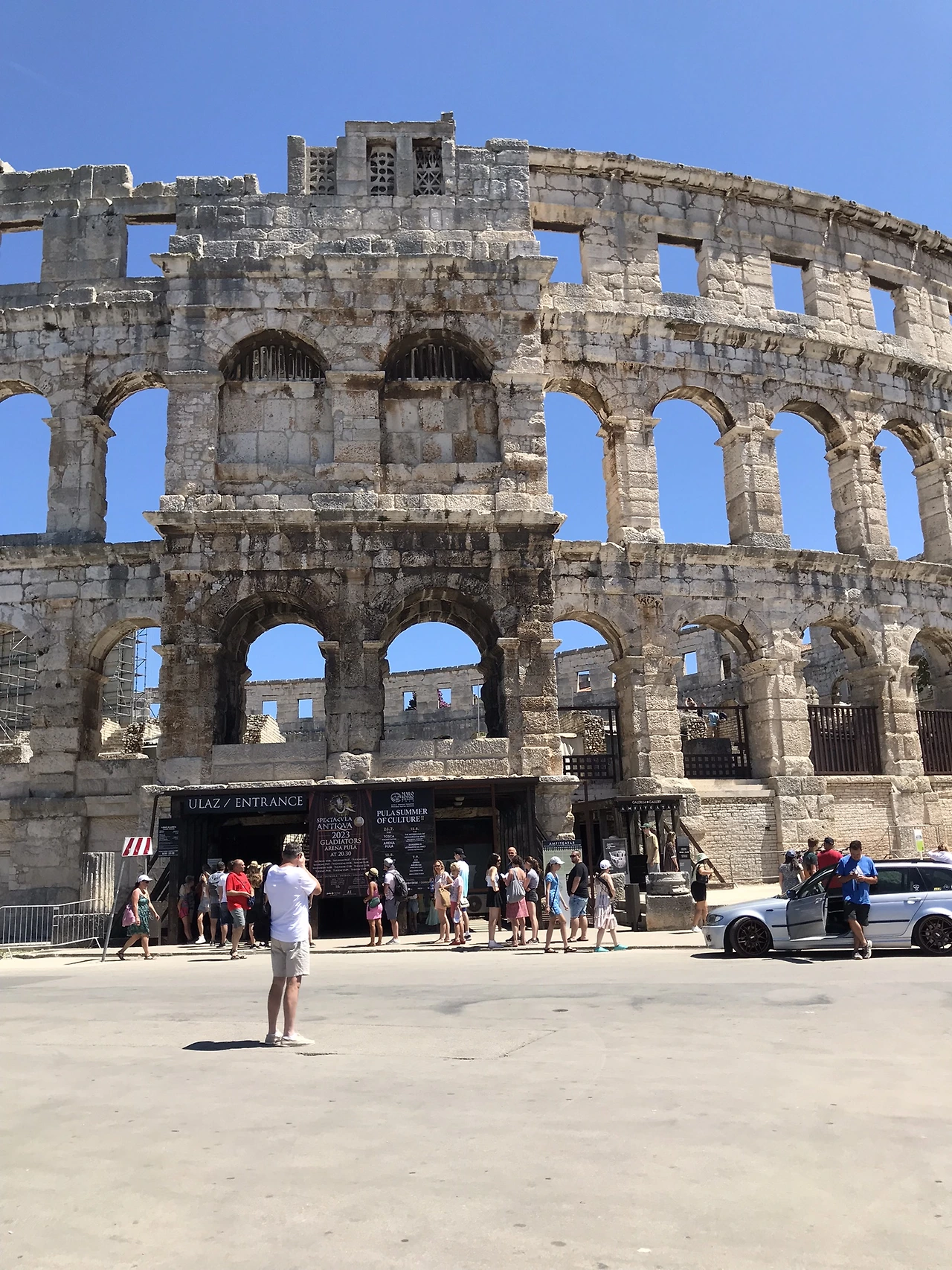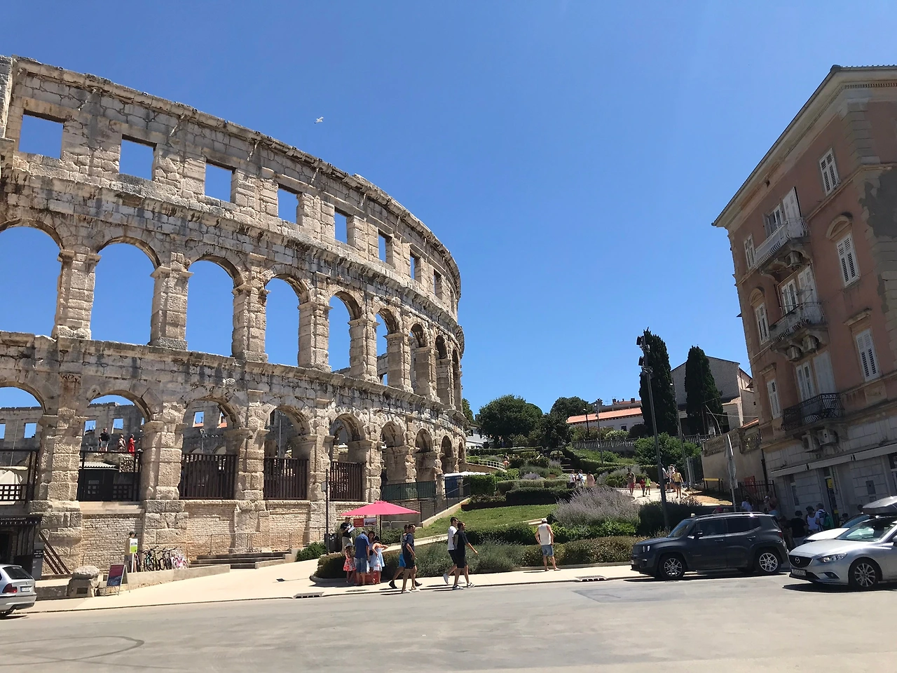 풀라 구시가의 첫인상은 청량함이었다. 유럽 다른 나라들처럼 작은 구시가지만 길가에 쓰레기 하나 없이 깨끗하다. 게다가 고개를 돌리면 바다가 눈에 들어오니 시야가 트인다. 여행의 8할은 날씨라고 하지 않던가. 40도가 넘는 폭염과 돌발성 폭우를 겪고 왔던지라 크로아티아의 맑고 온화한 기후가 너무 반가웠다. 바닷가가 가까이 있어서 그런지 밀라노에서 내 몸에 계쏙 붙어 다니던 모기조차 보이지 않는다. 공영주차장은 꽉찼지만 운좋게 아레나 옆 노상주차에 빈 곳을 발견하고 주차를 할 수 있었다. 관광지답게 주차비가 시간당 4유로나 된다.