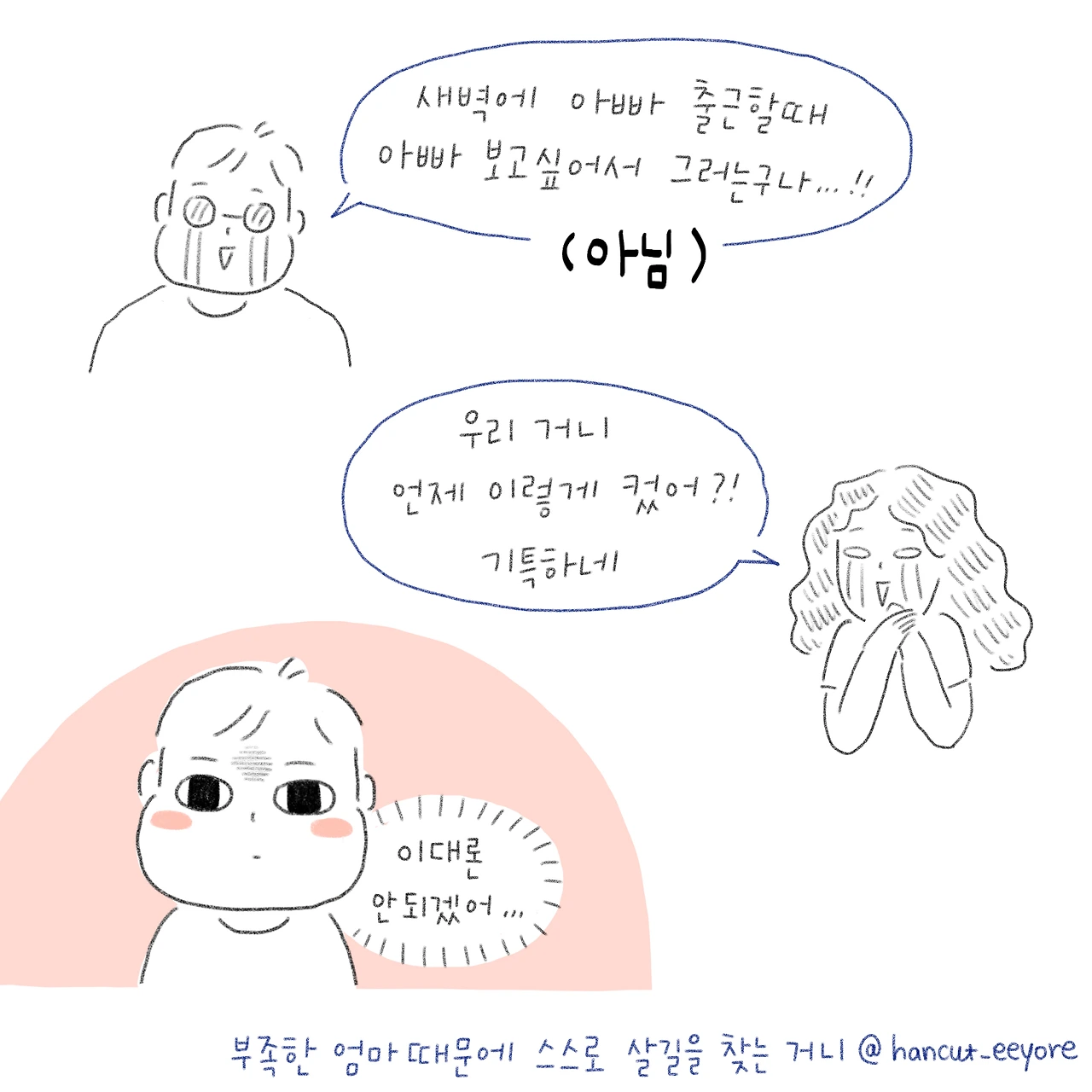 엄마가 부족한 점이 있어야 애가 스스로 성장하는거 아니겠냐고 하니 남편이 헛소리 하지 말라고 했음.