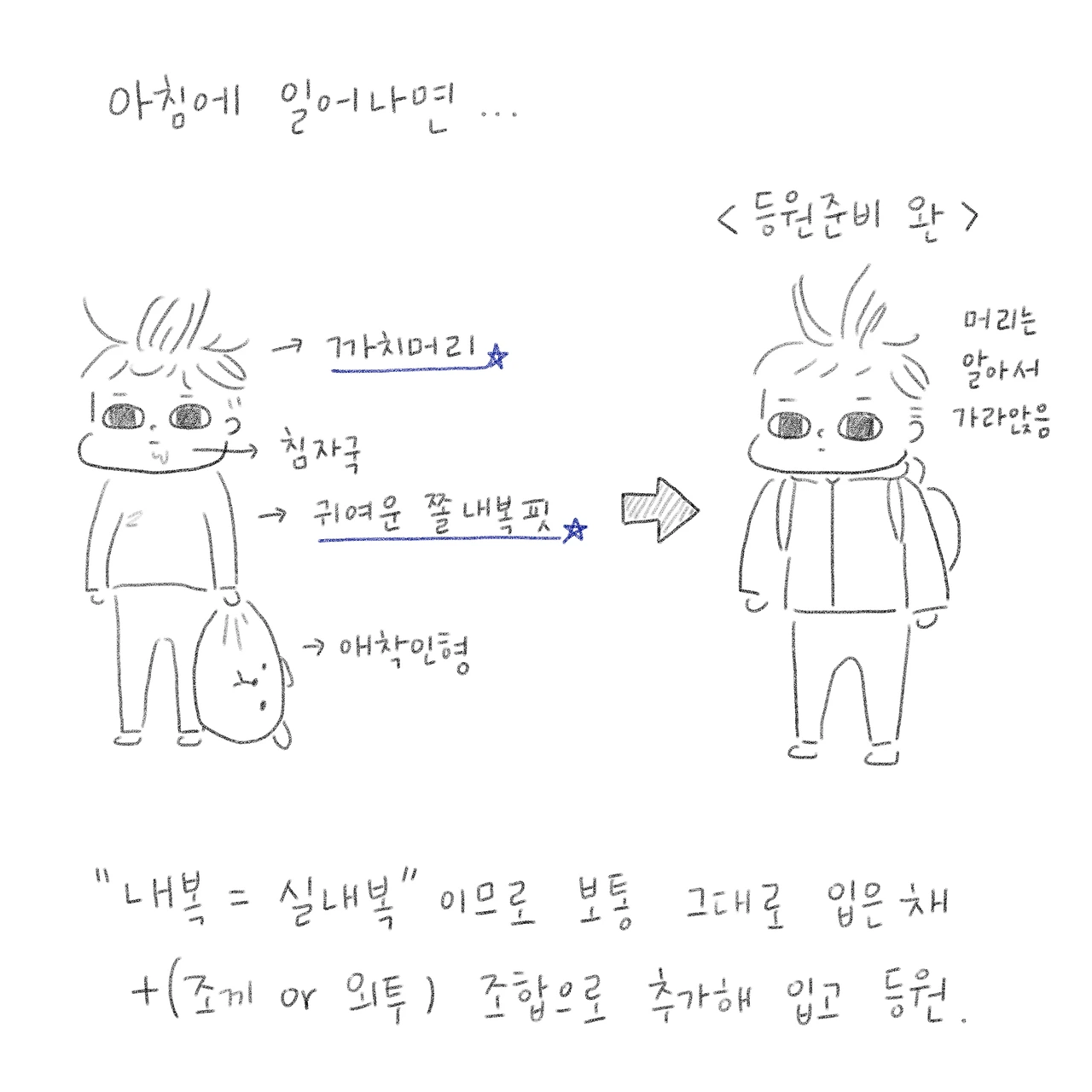 아침에 볼에 침묻히고 머리에 까치집 잔뜩 지어