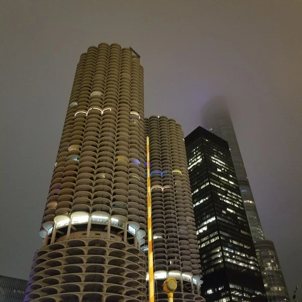 시카고에 있는 바우하우스(Bauhaus)가 디자인한 마리나 타워(Marina Towers). 마천루를 덮은 안개 위로 배트맨에게 도움을 요청하는 조명이 켜질 듯하다.