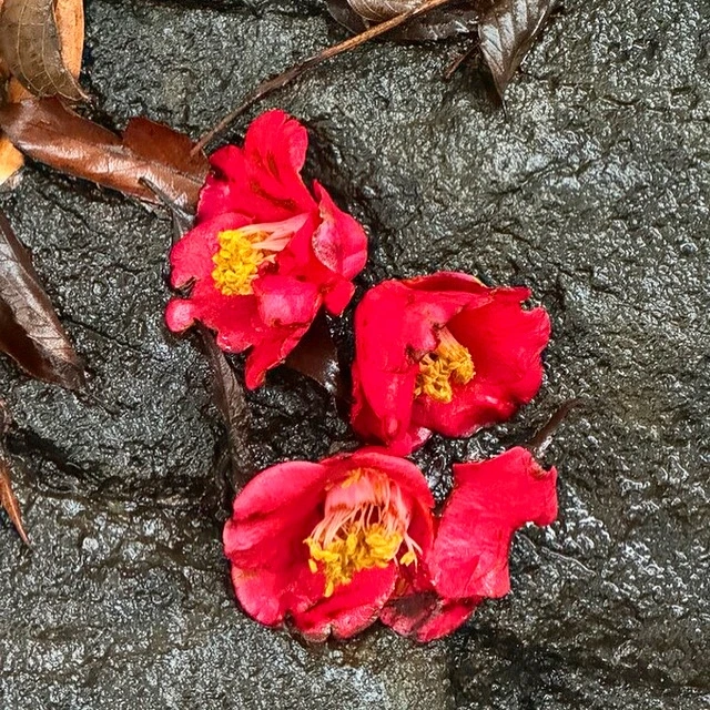 누군가 바닥에 떨어진 매화를 주워 바위 위에다 소담히 모아 놓았다. 그 색이 J가 챙겨온 우의를 닮았다. (사진=김금진)