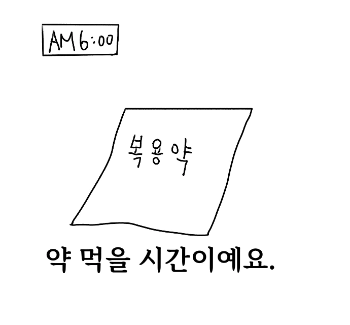 잠깐 의식이 흐려진 것 같았지만, 새벽 6시. 간호사 선생님의 교대 시간에 맞춰 병실 불이 환하게 켜졌다. 아침 약을 건네주시고, 혈압과 맥박, 체온을 재며 상태를 확인하셨다. 다시 불이 꺼졌지만, 이미 밤은 지나가 버린 뒤였다.