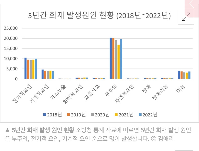 겨울에 눈이 오고 찬 바람 불면 야외활동보다는 실내에서 머무는 시간이 길어질 수밖에 없다. 따뜻한 겨울나기를 위해 가정 난방기구 사용량도 증가한다. 난방기구 종류는 전기난로, 전기, 온수 매트, 히터, 보일러 등이 있다. 난방기구를 잘 사용하면 따뜻한 겨울을 날 수 있으나 부주의하게 사용한다면 피부 화상을 입거나 화재로 이어질 수 있음을 기억해야 한다. 소방청 통계 자료에 따르면 5년간 화재 발생 원인은 부주의, 전기적 요인, 기계적 요인 순으로 많이 발생한다.