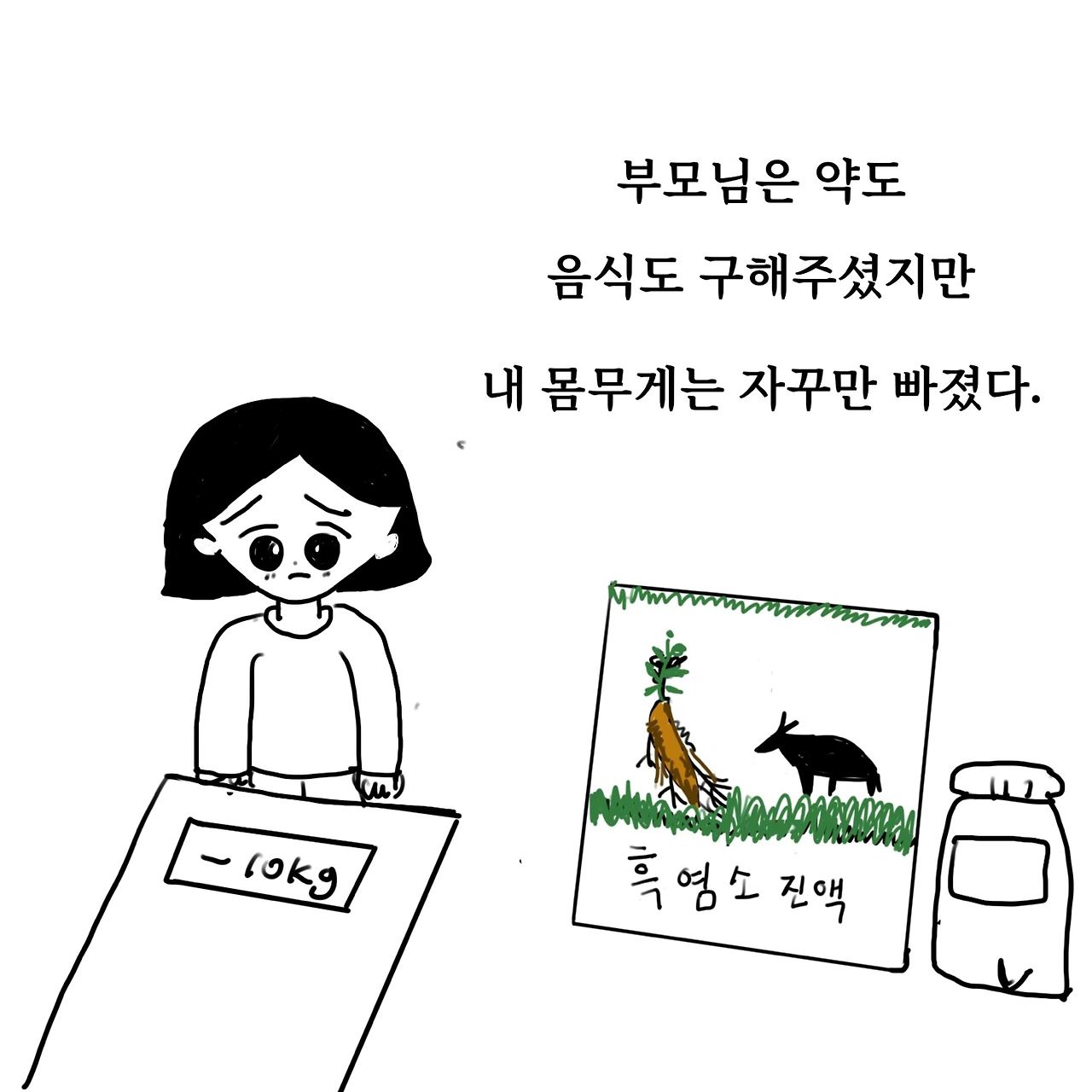 하지만 내 몸은 하루하루 깎여나가듯 마르고, 체중계는 10킬로를 잃은 나를 보여줬다. 식탁 앞에 앉아 있어도 밥을 넘길 힘이 없었고, 숨 쉬는 것조차 고통이었다.
