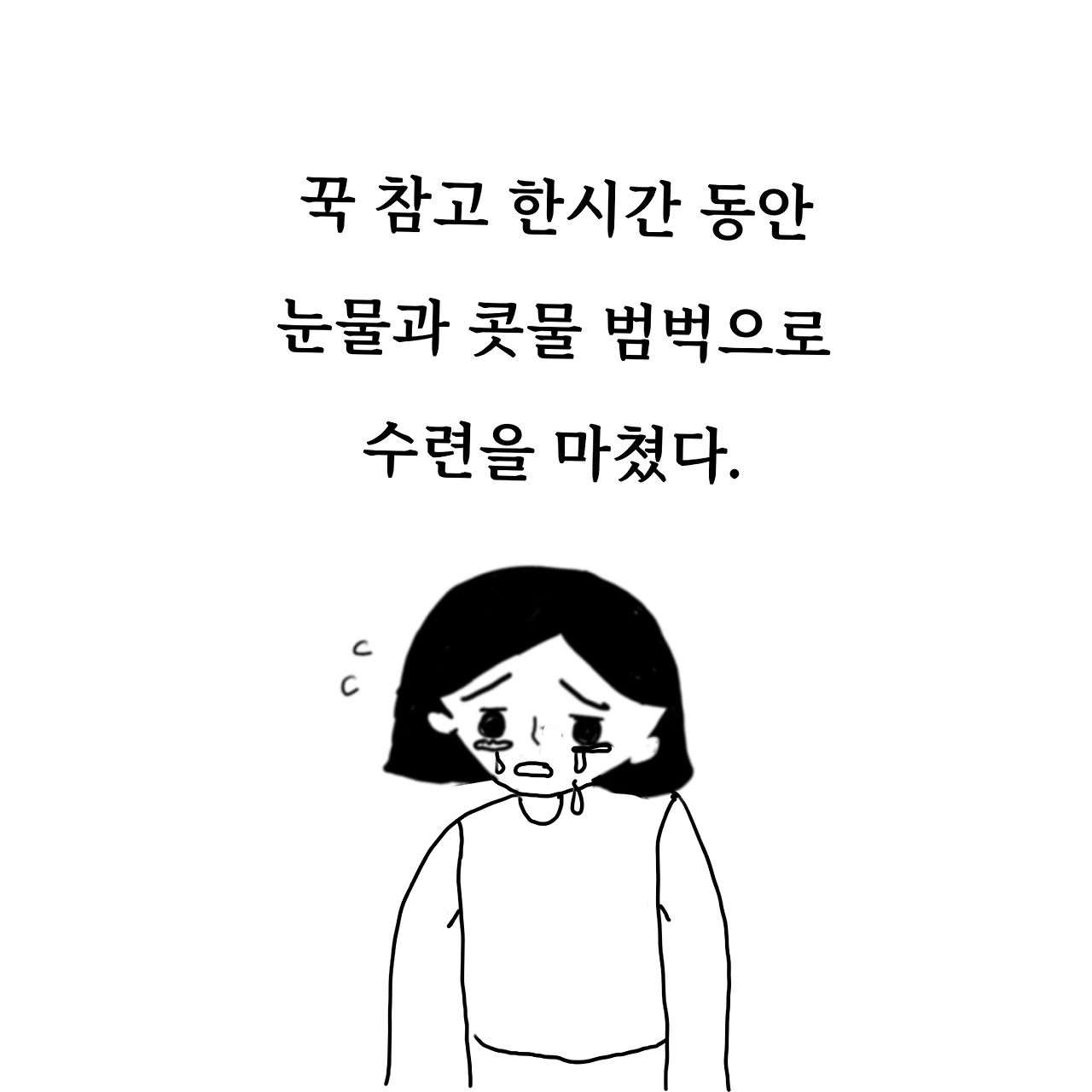 따스한 바닥 위에 요가 매트를 펼치고 앉자, 낯선 긴장감이 맴돌았다. 부장가 아사나, 코브라 자세를 10분 넘게 유지하는 동안 팔이 덜덜 떨렸고, 얼굴로 눈물이 흘렀다. 숨을 고르고 싶었지만, 발가락은 날카롭게 찔리는 듯 아팠고, 온몸의 감각이 마치 가시로 덮인 듯 따가웠다. 수련을 멈추고 싶은 마음이 수차례 들었지만, 나도 모르게 참고 있었다. 울음을 참다 흐른 눈물과 콧물로 범벅이 되었다.
