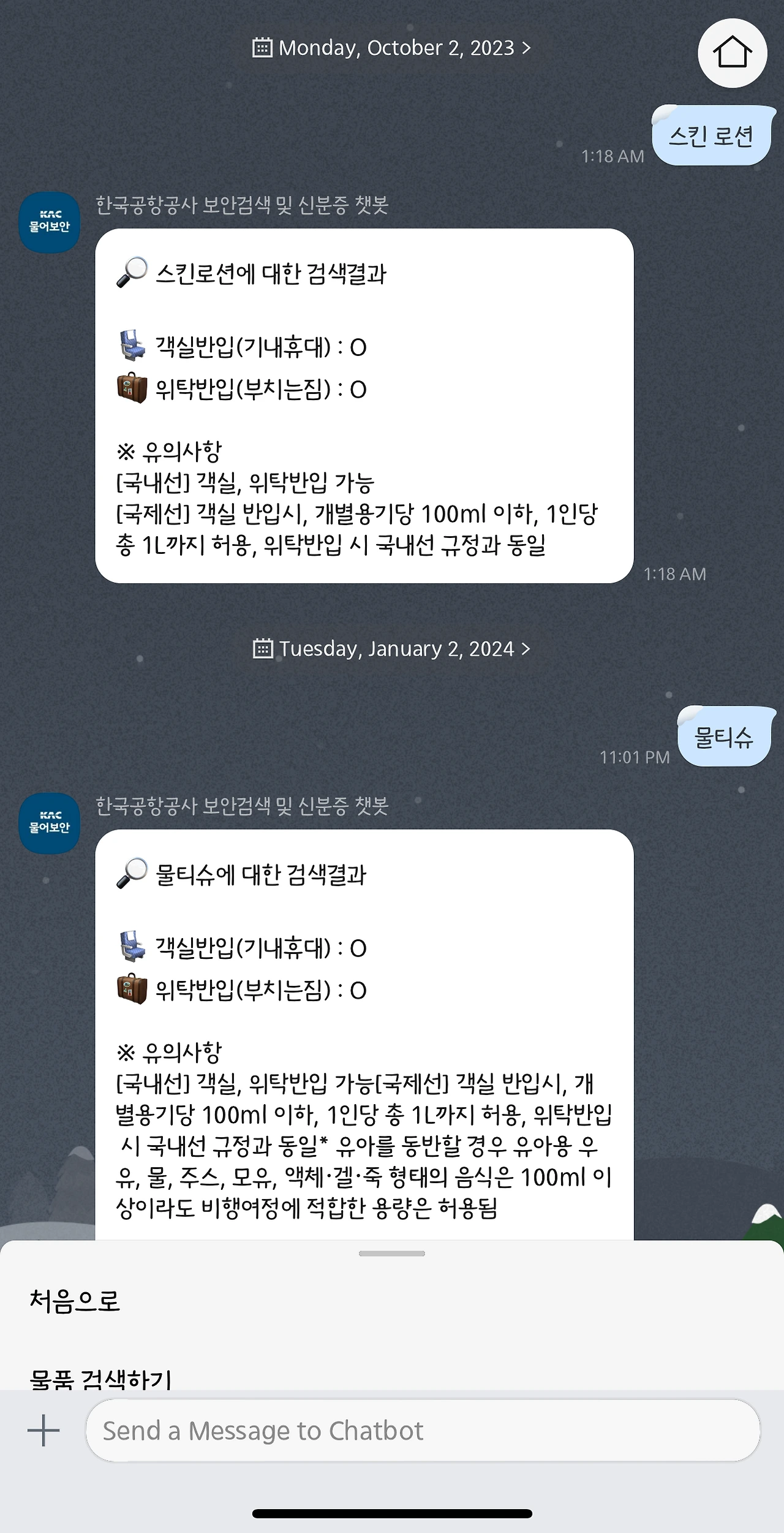 어디 유튜브 쇼츠에서 본 건데, 한국공항공사 보안검색 및 신분증 챗봇 플러스 친구를 추가하고 특정 물건을 채팅으로 보내면, 위탁 수하물, 기내 반입 규정에 대해서 안내해 준다. 기내, 위탁 반입에 O 표시가 되어 있더라도 유의사항을 한번 더 확인하고 챙기면 공항 검색대에서 걸릴 일은 없을 듯하다.