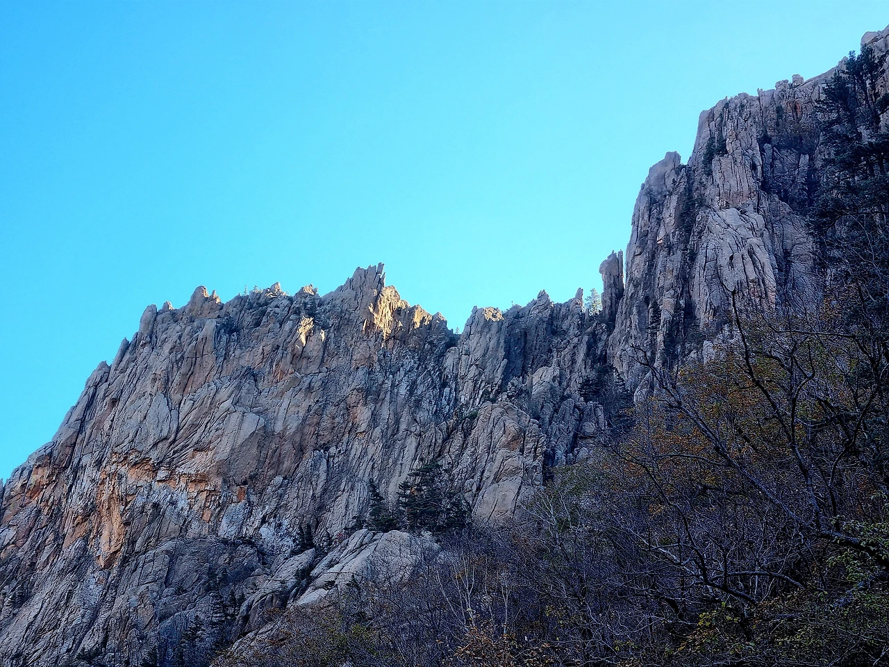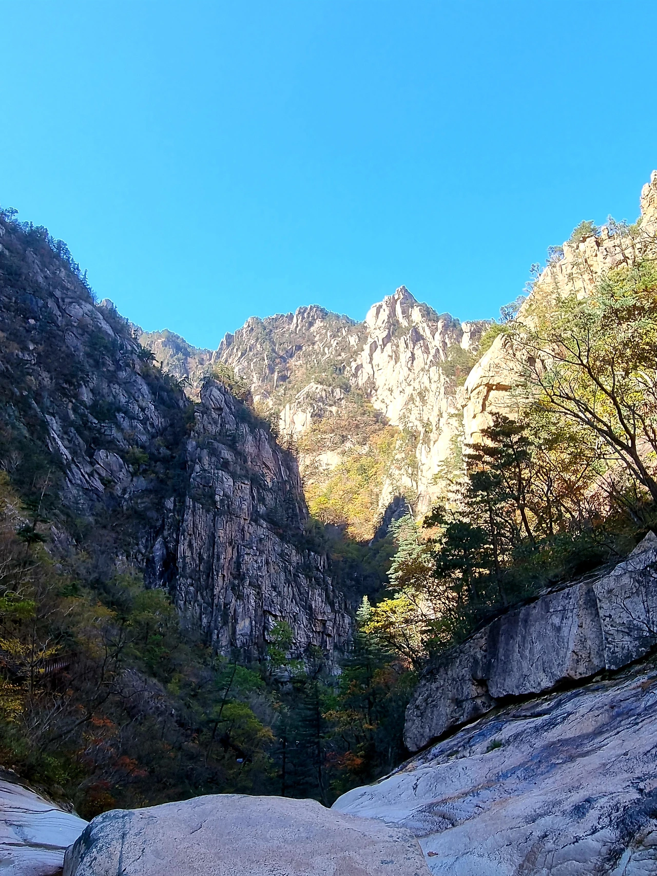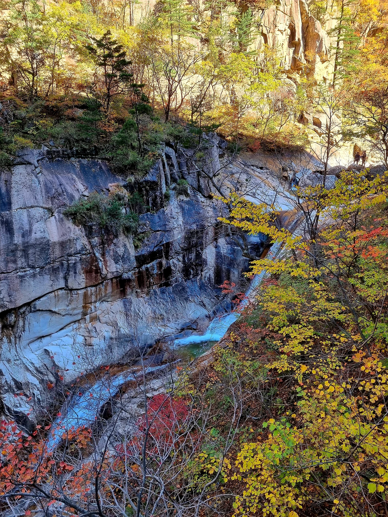 공룡능선 남쪽 끝자락 신선암천불동 계곡으로 내려가는 길은 아직 단풍이 남아있다. 빨갛게 물든 멋진 자태는 아니지만 봐줄 만한 모습이다. 계곡 좌우로 높이 치솟은 절벽이 하늘을 가리고 있다.