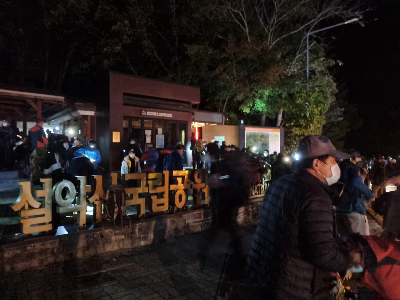 오색 탐방지구 등산로 입구드디어 출입문이 열리고 불빛 행열이 설악산으로 빨려 든다. 헤드랜턴 불빛이 어둠에 잠긴 설악산을 열어젖히는 순간이다. 모세의 길이 열리듯 수많은 불빛이 설악산을 파고들며 등산로를 밀고 올라간다.