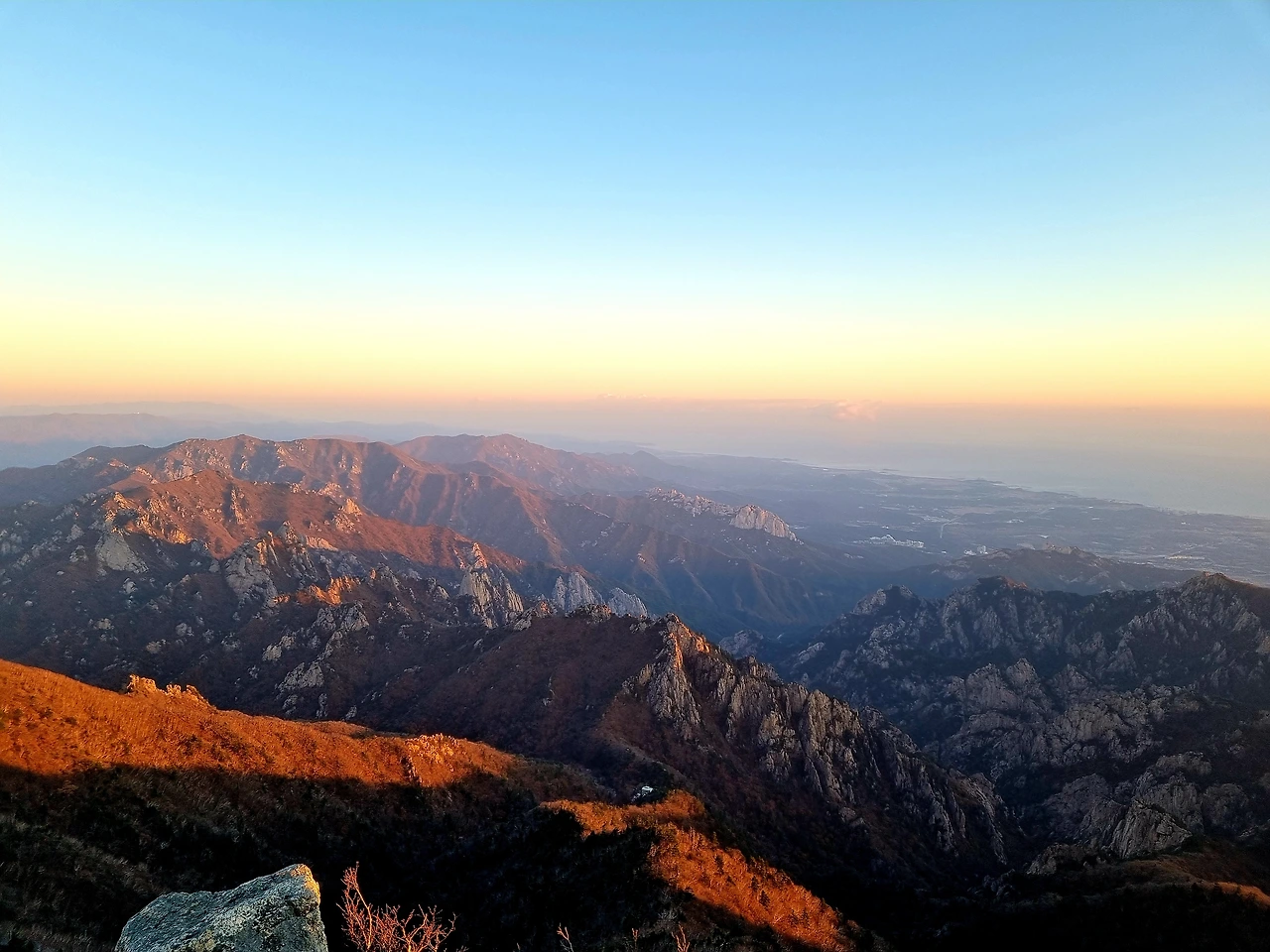 하늘에는 아직도 달이 떠 있고, 오색 방향과 한계령 방향으로는 길게 이어진 능선들이 희미하게 보인다. 한계령에서 중청대피소 방향으로 이어지는 능선에는 헤드랜턴 불빛이 반짝거린다.