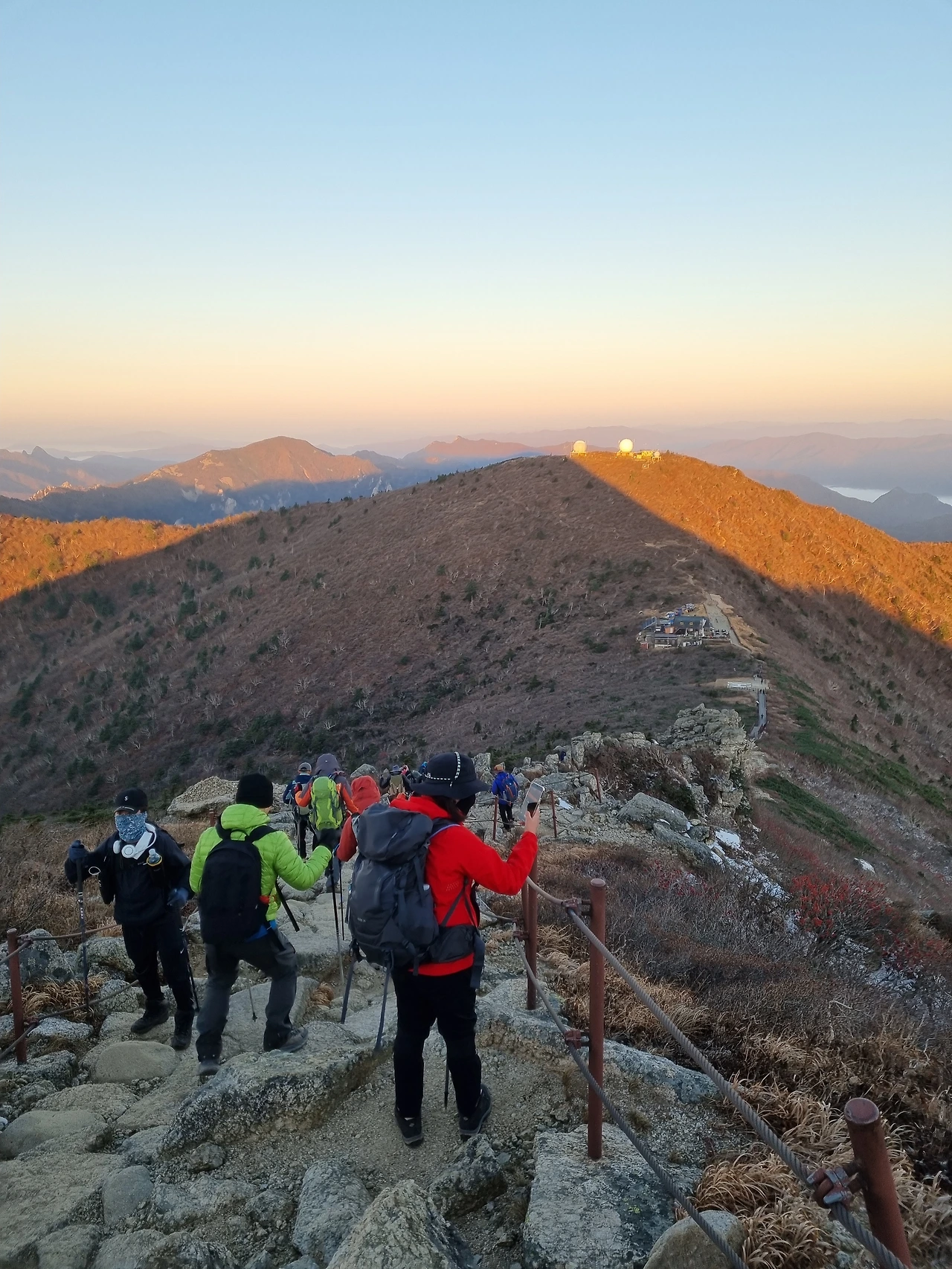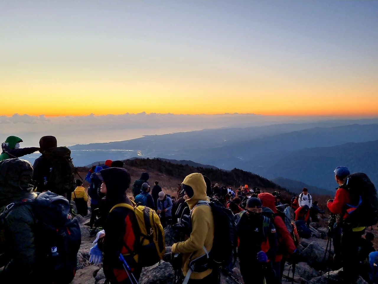 어둠이 어슴푸레 걷히고 있을 때 정상에 도착한다. 먼저 도착한 산객들이 여기저기 흩어져 있고, 인증사진 찍으려는 인파가 30여 명 줄을 선 정상의 모습이다.