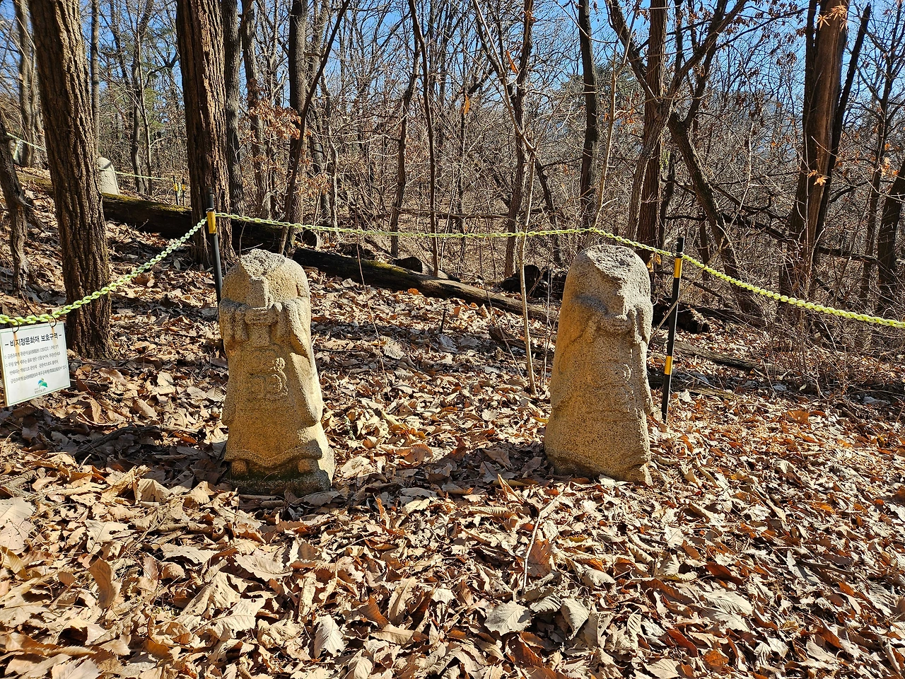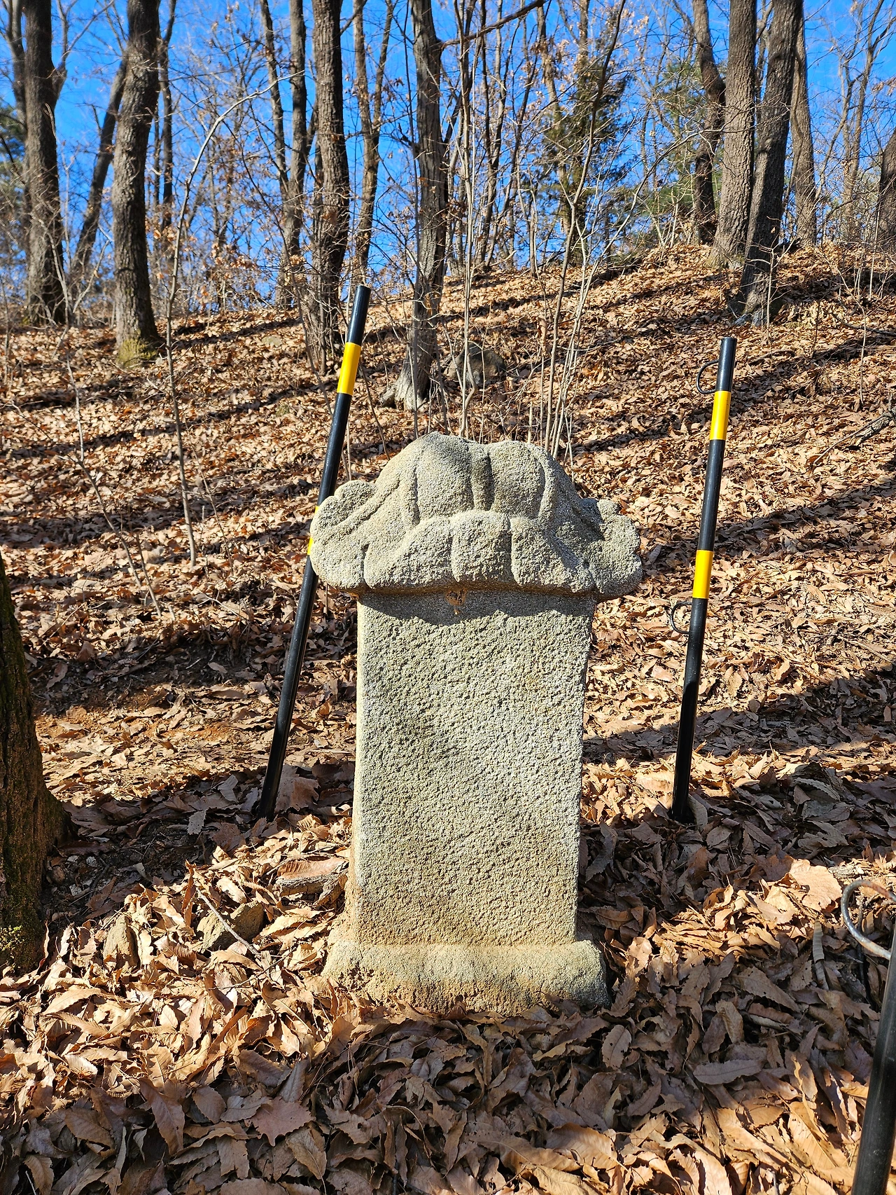 아래쪽 길로 내려오자, 인터넷에서 보았던 무덤 석물들이 보이기 시작한다. 그렇다. 산 능선에 무덤을 조성할 일은 없었고, 무덤들은 이말산 남쪽 사면을 따라 자리 잡고 있었다.