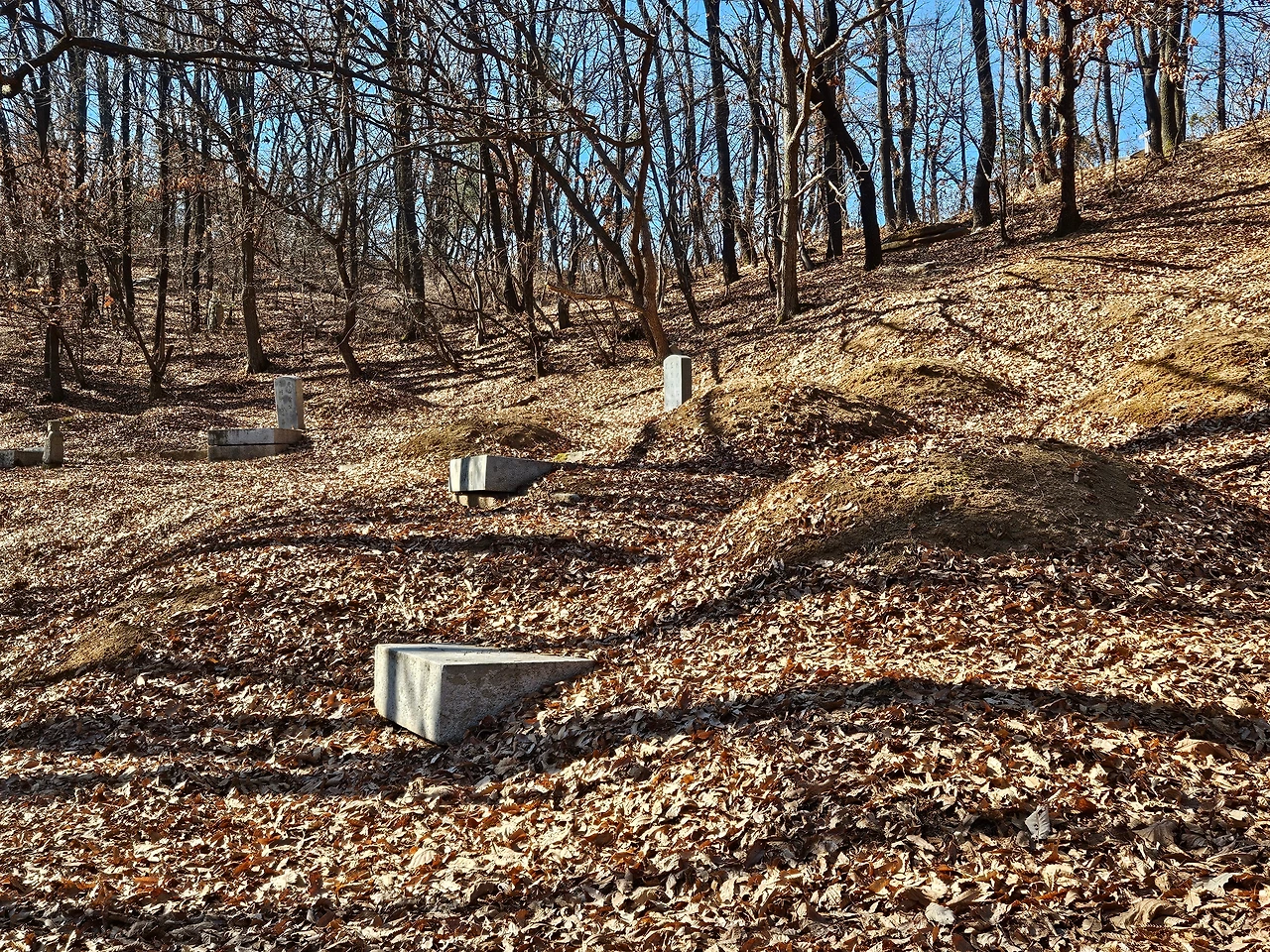 산으로 올라왔지만 무덤은 하나도 보이지 않는다. 공동묘지 산으로 알고 왔는데, 전쟁을 위한 요새라는 생각이 먼저 든다. 궁녀들의 흔적은 어디에서도 찾아볼 수 없고, 잡풀 무성한 벙커와 방공호가 을씨년스러운 분위기로 다가온다. 몇 걸음 더 걸어가니, 어느덧 산 정상부 능선에 도달했다.