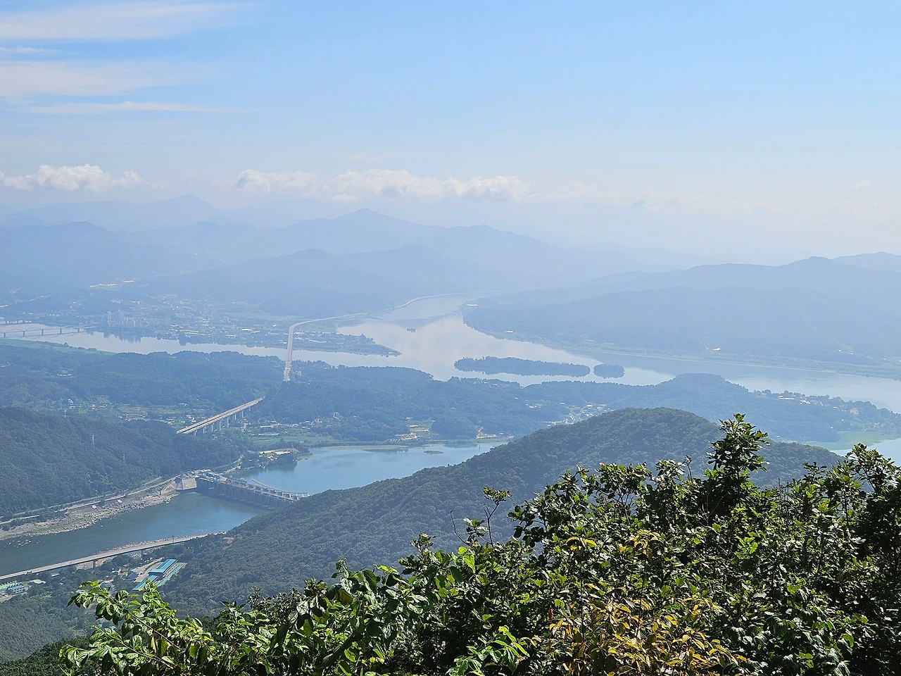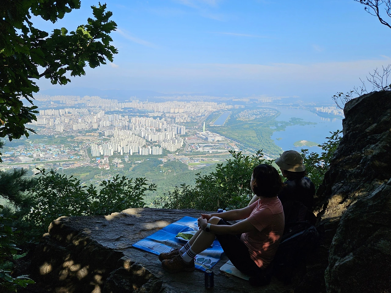 With a sense of urgency to finish my hike before the heat sets in, I’m already heading toward the summit. After roughly an hour of pushing myself, I arrive at a spot overlooking the Han River and the city of Hanam below.