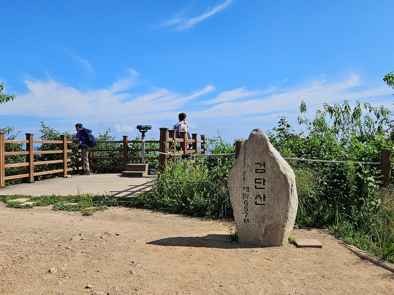 Reaching the summit, I find a broad, open space with a stone marker labeled “Mt. Geomdan.” Walkways to observation decks stretch out on either side.