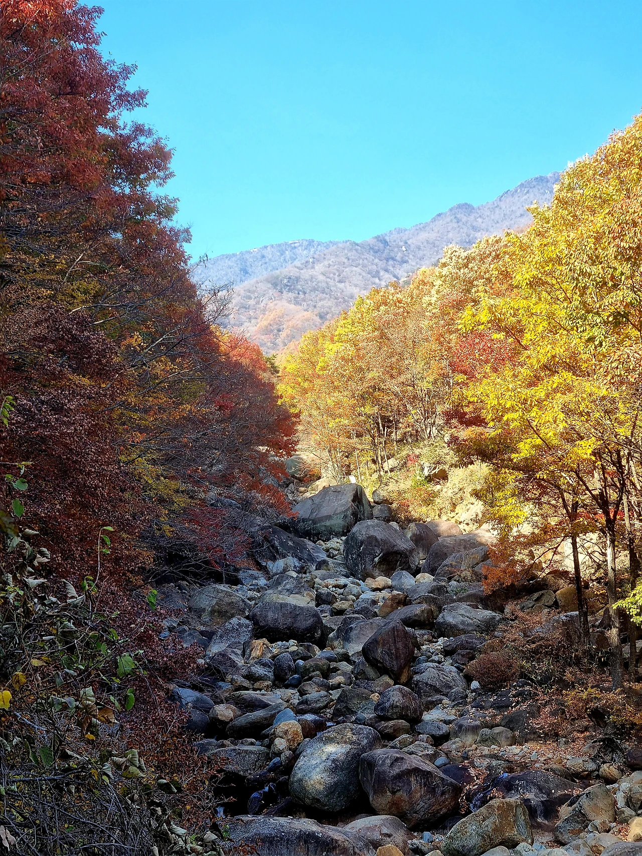법계사하산길은 지루한 돌계단이 끝없이 이어진다. 무릎에 부담은 느껴지지만 중산리 계곡의 단풍은 고도가 낮아질수록 화려함이 점점 더해간다.