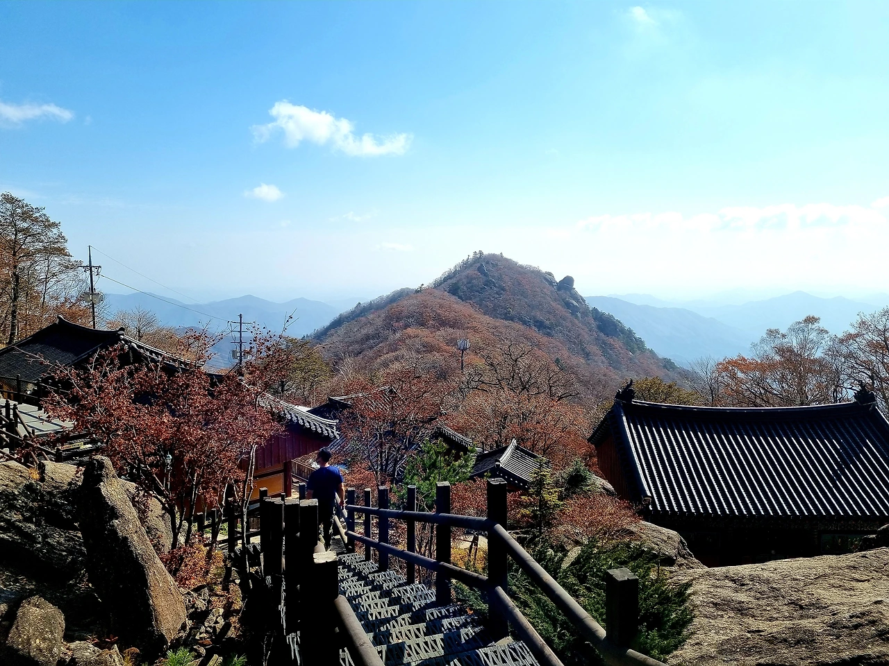 뒤로 돌아 계단을 올라서니 사찰의 늦가을 모습과 건너편으로 보이는 봉우리가 조화를 이루며 한 폭의 풍경화 같은 멋스러움이 느껴진다.
