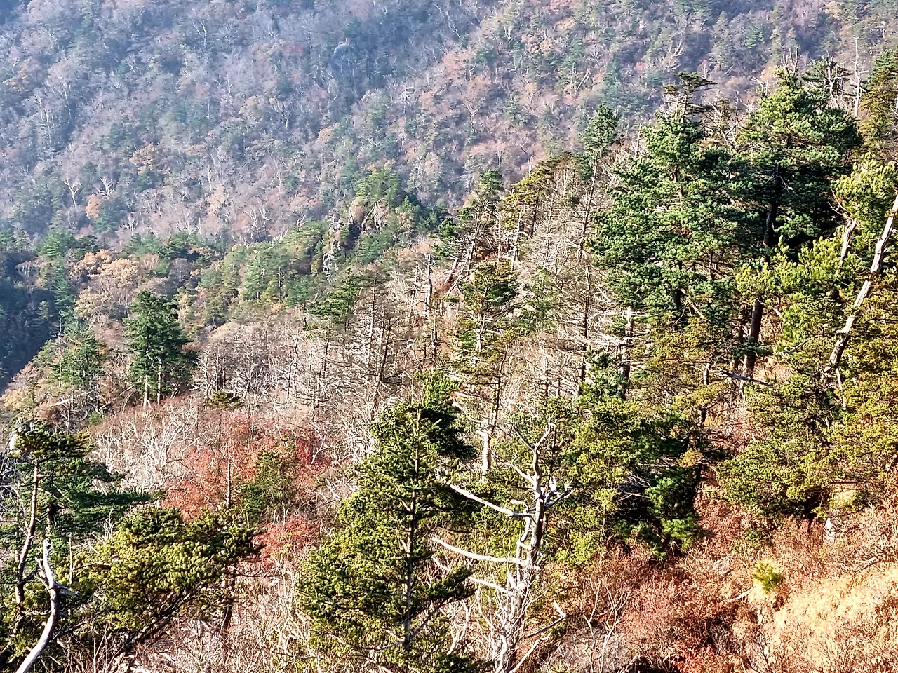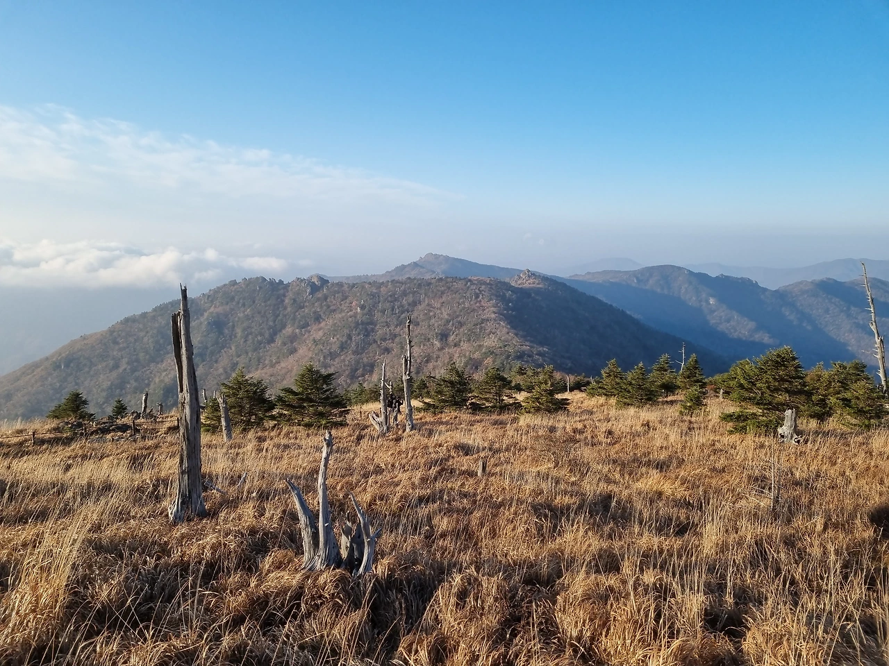 제석봉으로 오르는 길 왼편으로 낮은 수풀로 덮인 완만한 경사지가 보인다. 갈대처럼 바짝 마른풀 속에 죽은 나무들이 삐쭉삐쭉 솟아있는 기이한 모습을 하고 있다.