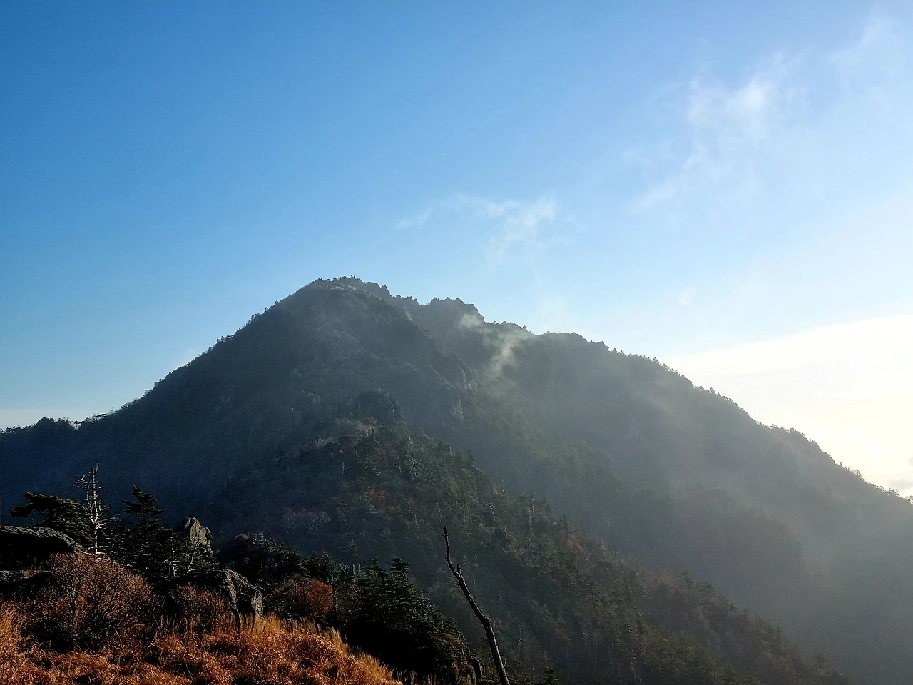 어둠 속을 2시간 여 쉼 없이 오르니 산의 윤곽이 희미하게 보이기 시작한다. 시간이 지나며 산줄기가 선명해지고 앙상한 나무들이 보인다.