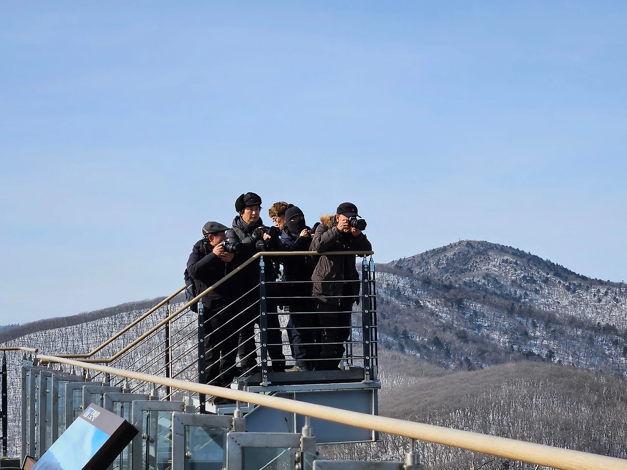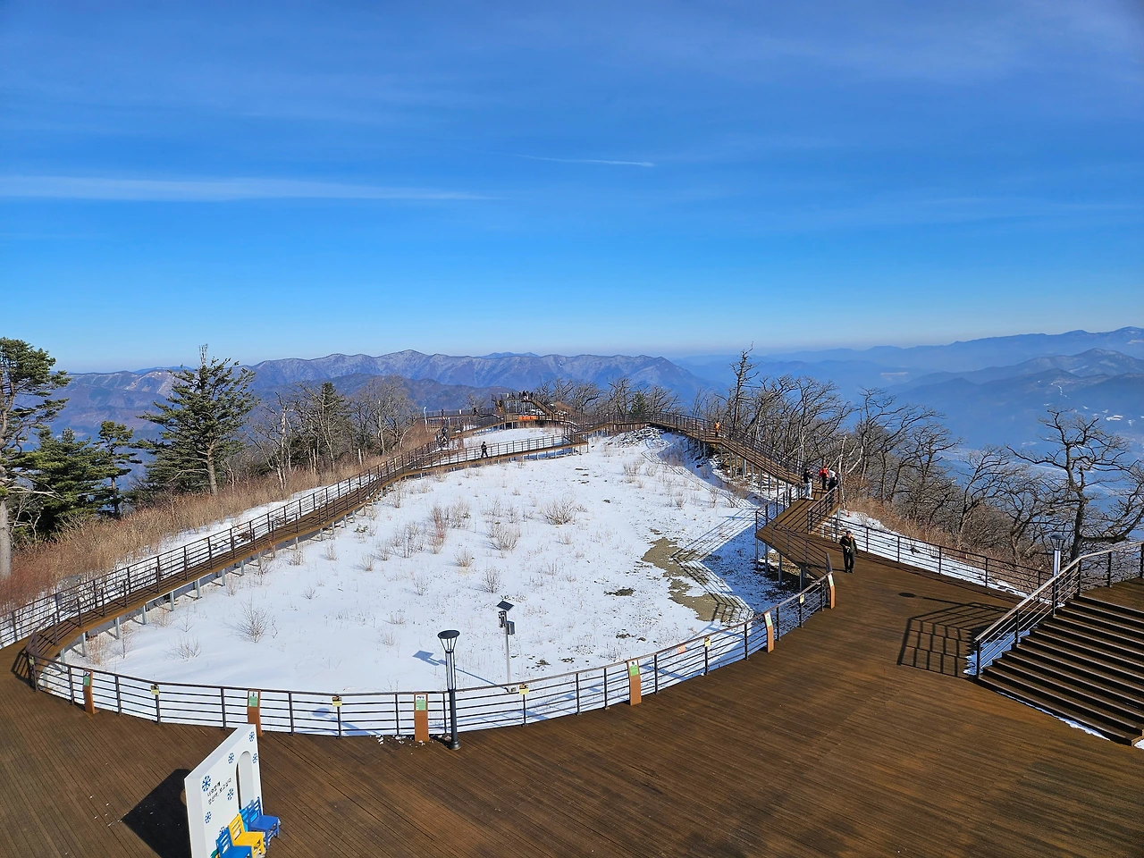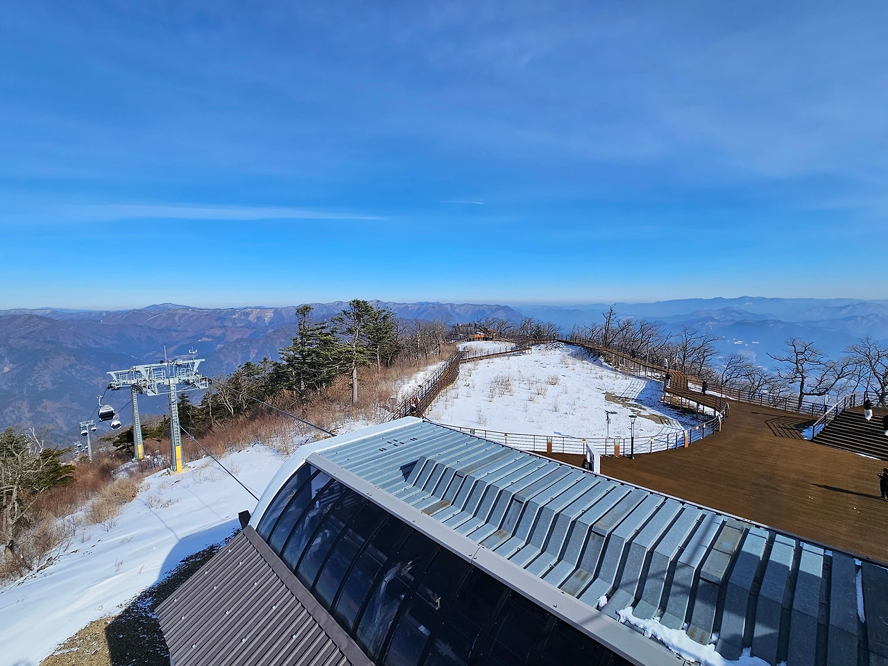 스키 경기가 열렸던 슬로프 위로 곤돌라를 타고 올라가며, 그 시절의 기억을 더듬는 사이 어느새 정상에 도달한다. 곤돌라 문이 열리며 눈앞에 펼쳐지는 풍경은 그야말로 눈부시다. 시원하고 깨끗한 공기, 온몸으로 느껴지는 산의 생동감, 모든 것이 아름다움으로 가득하다. 산꼭대기에 조성된 데크길은 마치 천상의 공원길처럼 꾸며져 있다.