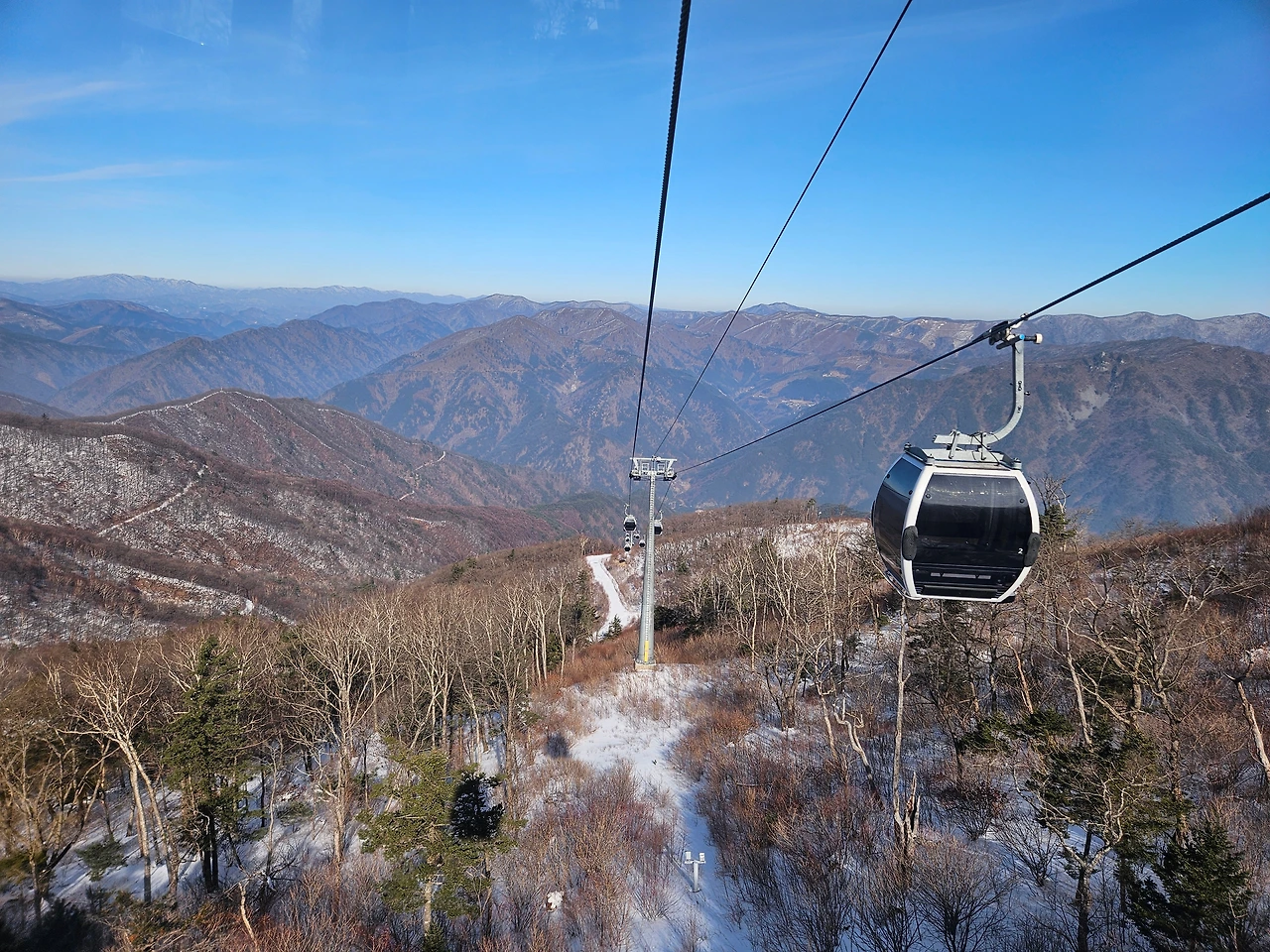 곤돌라에 올라타자마자 곤돌라가 미끄러지듯 스르르 움직이며 탑승장에서 천천히 멀어진다. 고도가 점점 높아지며 마을 전체가 시야에 들어오고, 그 풍경 뒤로 끝없이 펼쳐진 산줄기가 점점 더 선명하게 다가온다. 나는 마치 신선이 되어 세상을 뒤로하고 하늘로 둥둥 떠오르는 기분 느낀다.