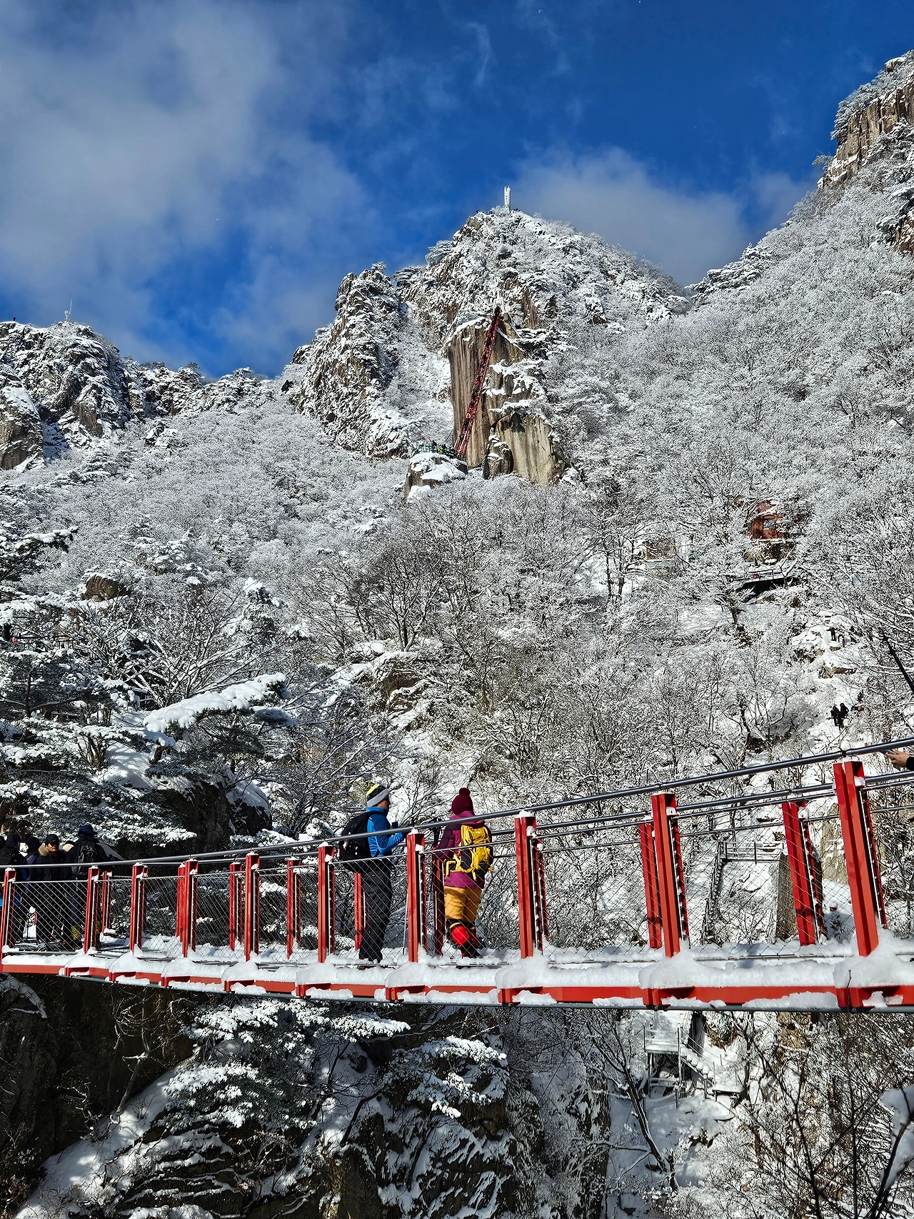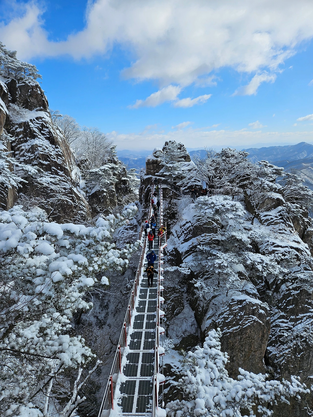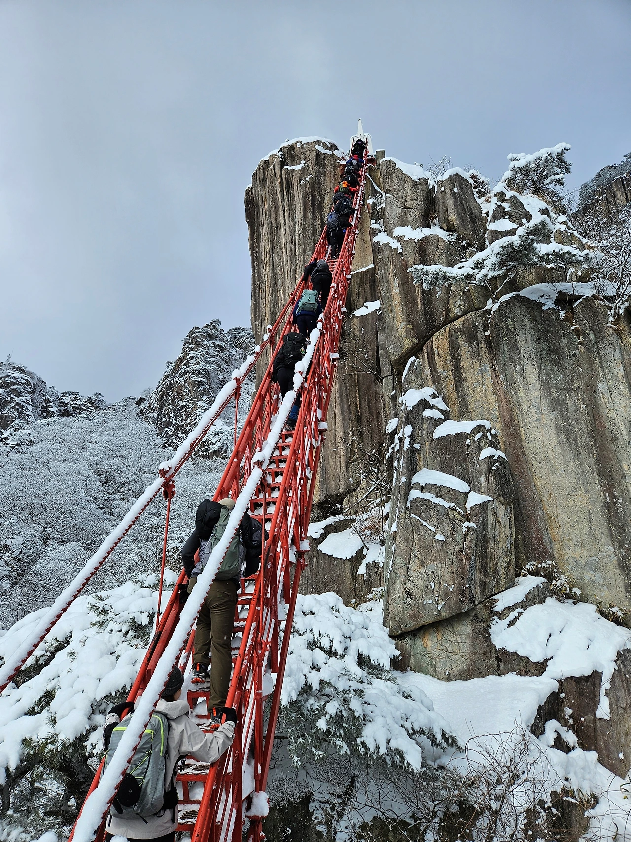 케이블카가 산 중턱에 도착하자, 나는 아이젠을 착용하고 본격적인 산행 준비를 마친다. 이제부터 본격적인 산행이 시작된다. 구름다리 앞에 이르니 풍경사진을 찍는 사람들로 장사진을 이룬다. 구름다리도 멋지지만, 그 뒤로 보이는 정상 봉우리와 삼선계단이 어우러져 달력 사진에 실어도 손색없을 정도로 아름다운 풍경을 자랑한다.
