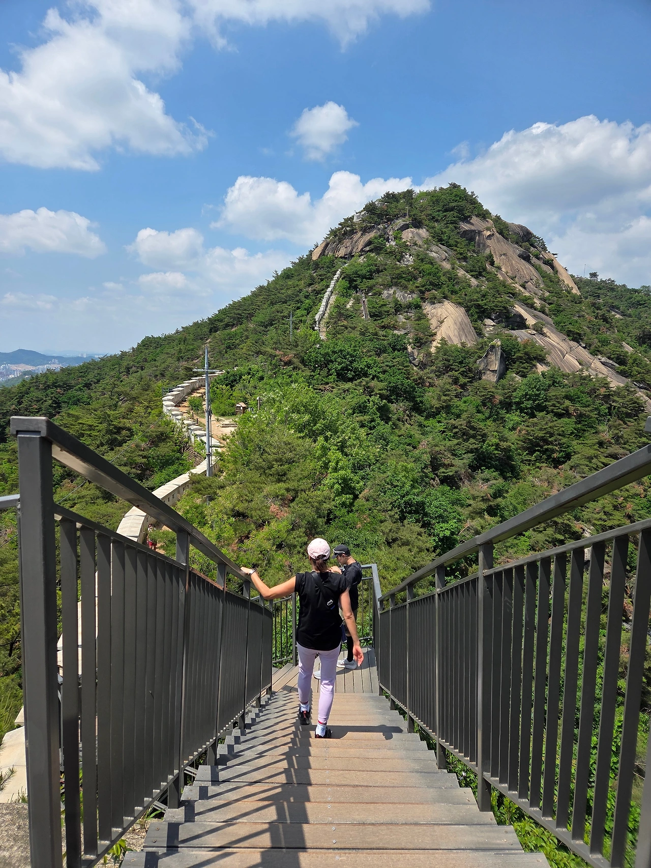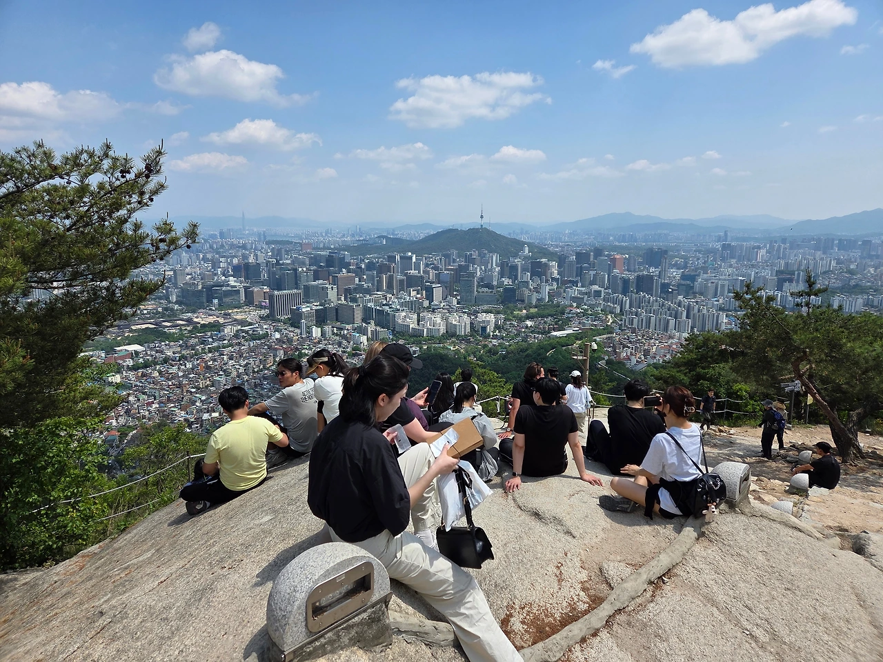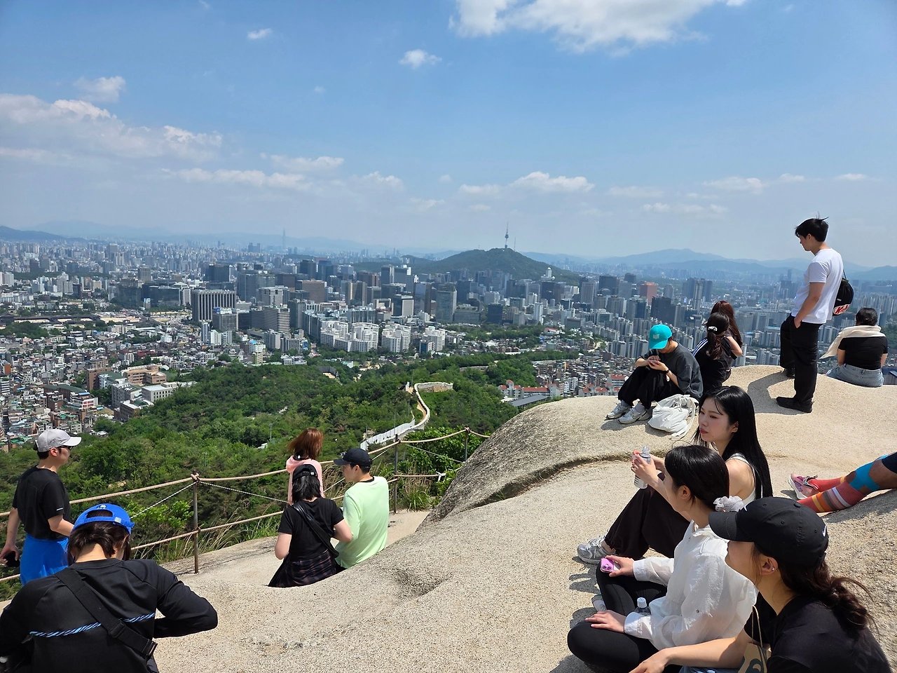 호랑이 머리가 가리키는 방향을 따라 오르니, 한양도성을 따라 이어지는 등산로가 나타난다. 계단길을 오르내리는 사람들로 붐빈다. 성벽 옆 등산로를 따라 걷기 시작하자 등에 햇살이 내리쬐고, 금세 등줄기가 축축해지는 것이 느껴진다. 조금 더 올라가자 저 위쪽 바위에 사람들이 모여 있는 모습이 눈에 들어온다.