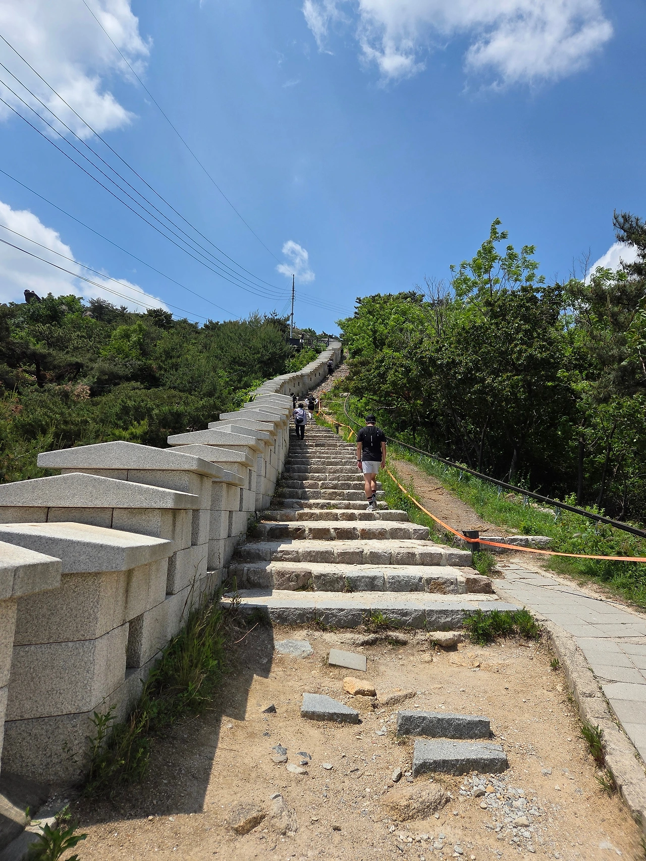 정상으로 오르는 길은 성벽을 따라 잘 정비되어 있다. 봉우리가 손에 잡힐 듯 가까워 보이지만, 나무 그늘 하나 없이 땡볕을 온몸으로 받아야 하는 구간이라 걱정부터 앞선다.