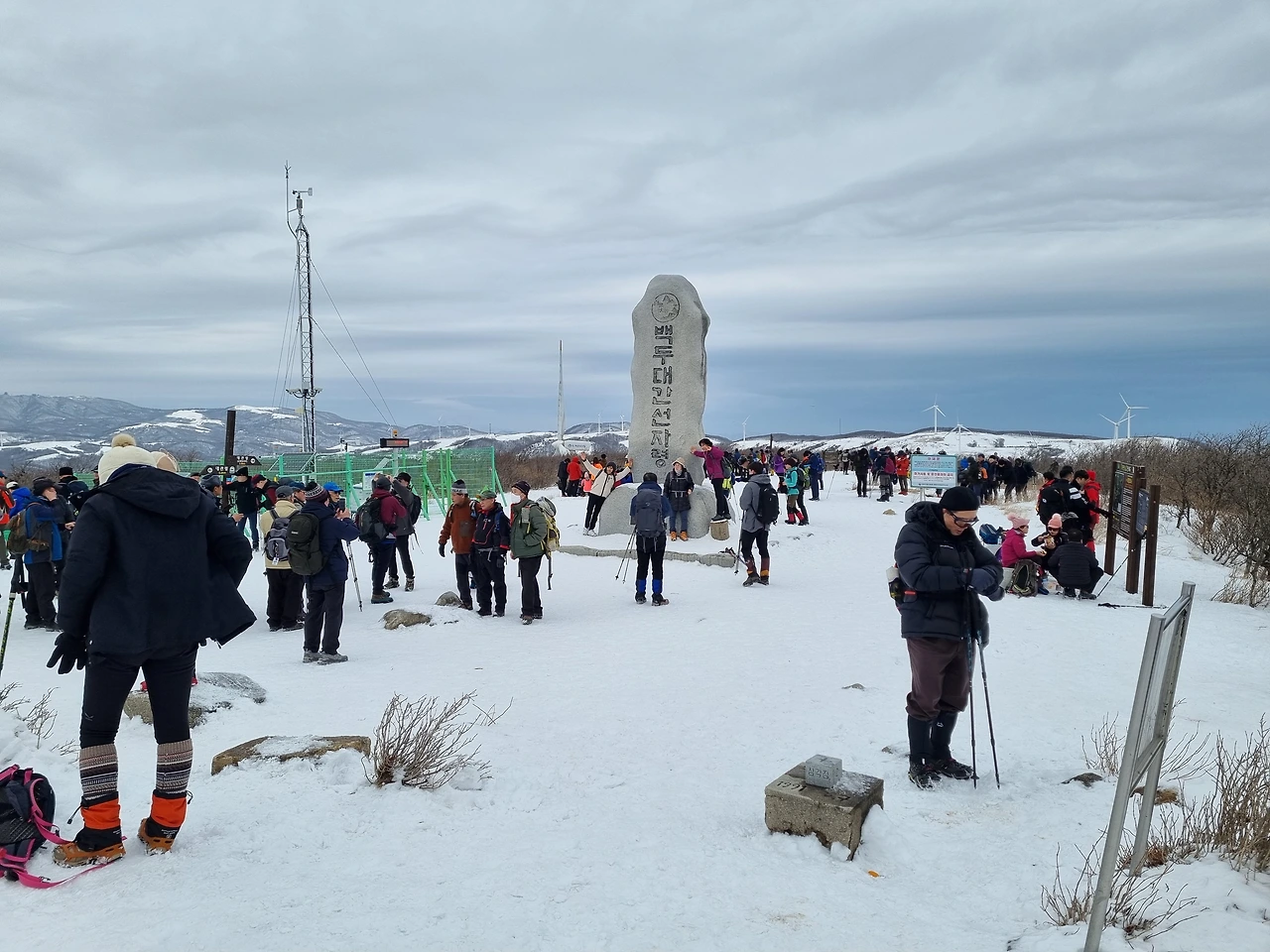 저 멀리 강릉 시내가 흐릿하게 보이고, 산 아래쪽으로 영동고속도로가 지난다. 남북으로는 눈 덮인 백두대간 줄기가 장쾌하게 뻗어 있다.